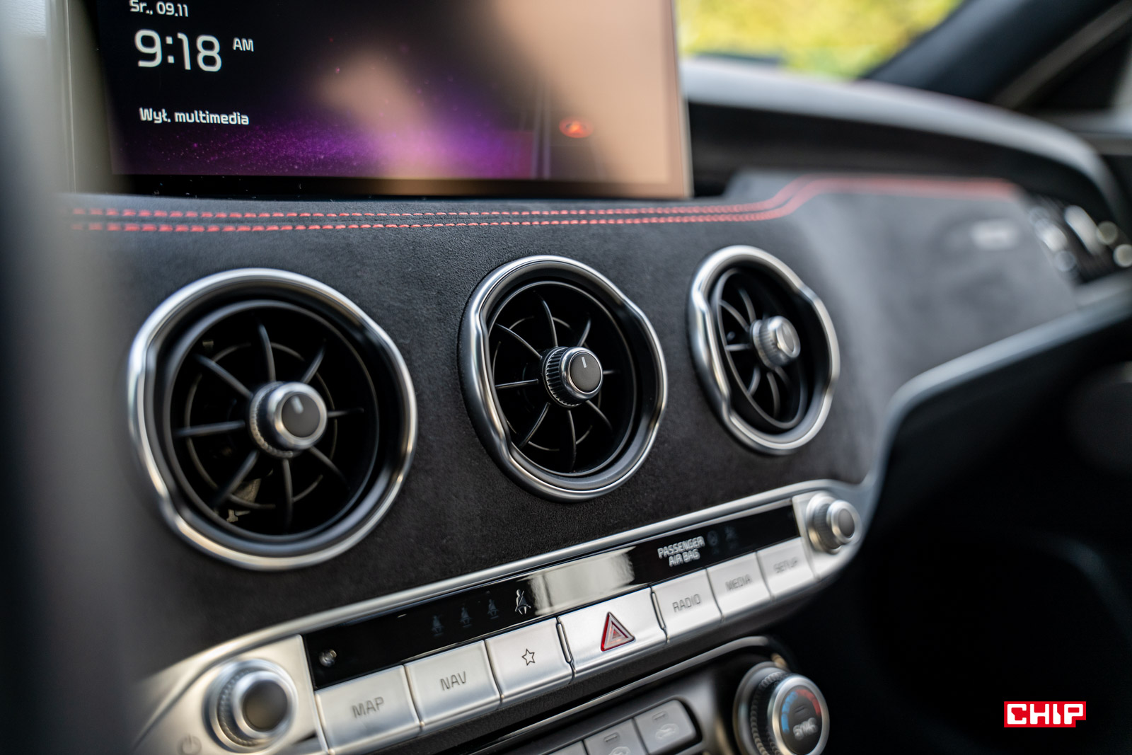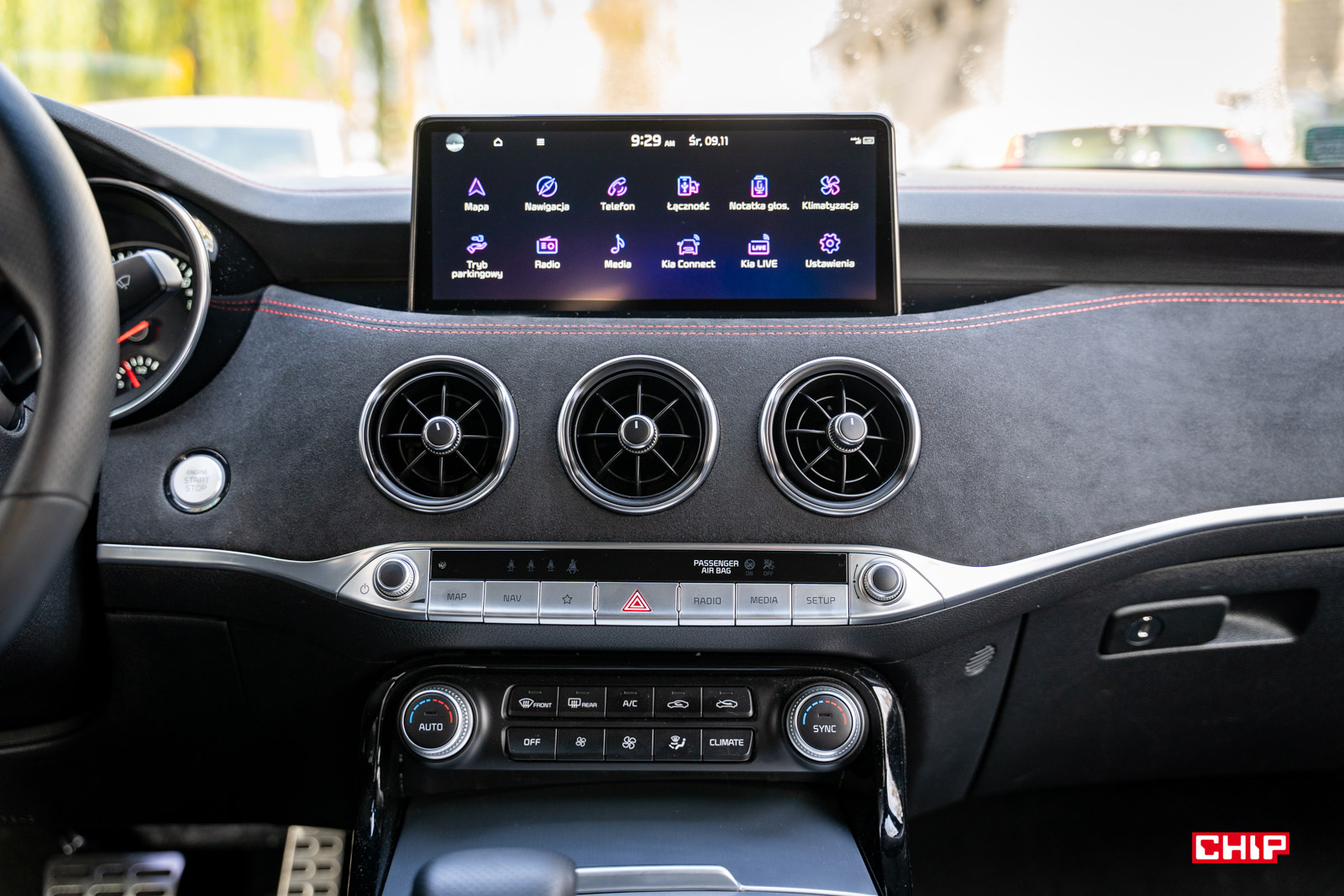 Kia Stinger GT zachowuje sporo klasycznych rozwiązań. Mamy tu fizyczne, okrągłe zegary i sporo fizycznych przycisków. W tym regulacji klimatyzacji. Choć małym minusem jest brak choćby diodowych ekranów pokazujących aktualną temperaturę. Ta wyświetlana jest w górnych rogach ekranu, dopiero po przekręceniu pokręteł.