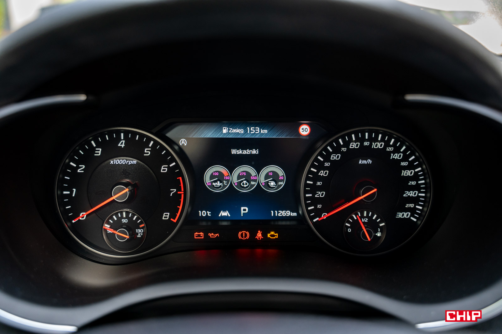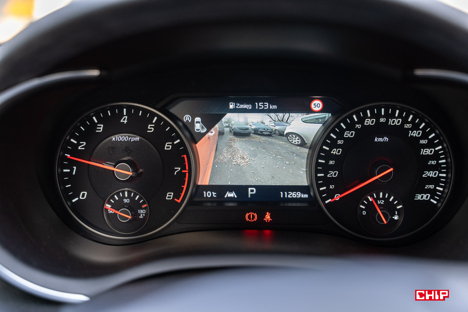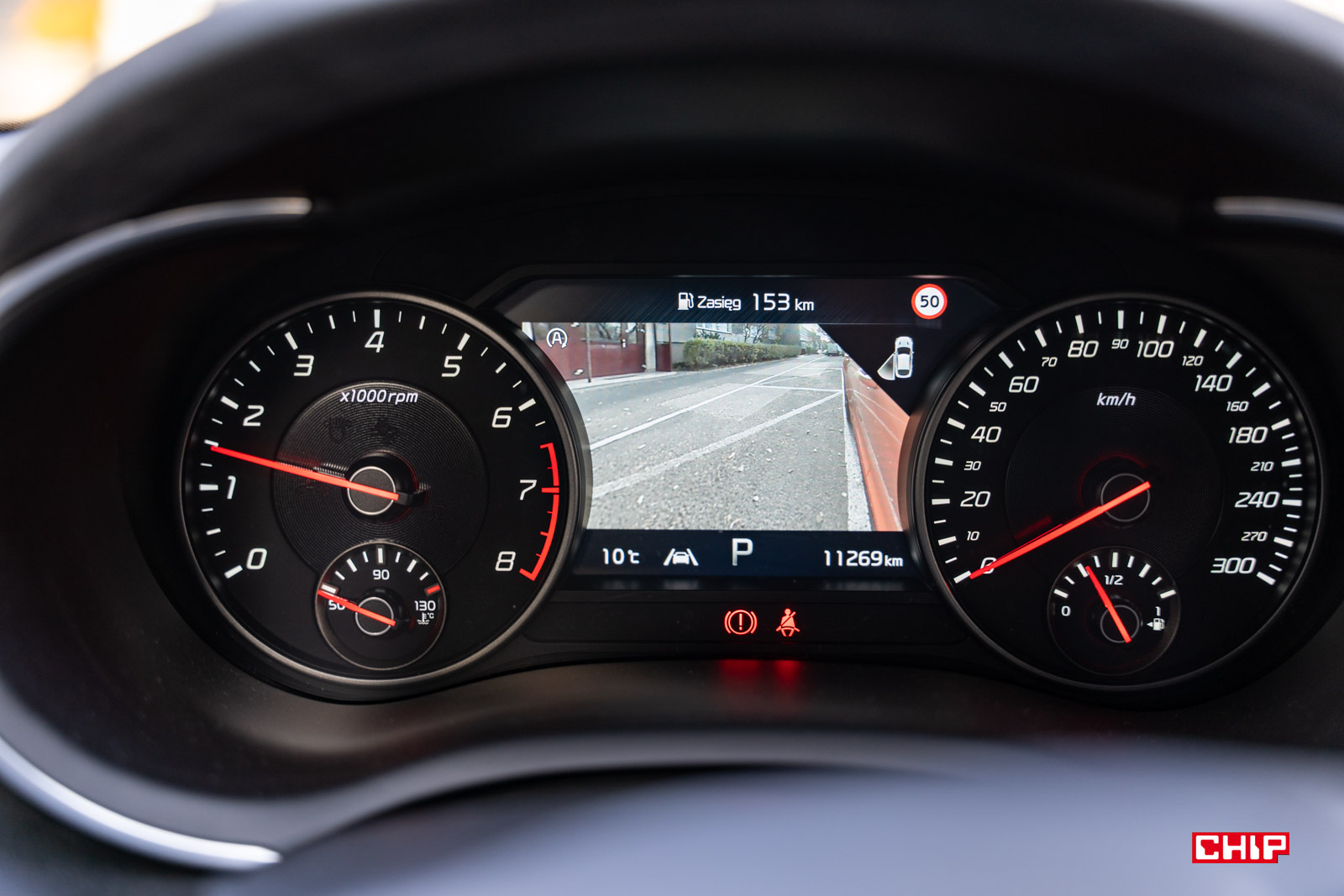 Ekran kierowcy jest nieduży nam na dzisiejsze standardy, ale czytelny i bardzo dobrej jakości. Na nim wyświetlane są informacje o podróży, czy niektórych aktualnie używanych funkcjach. Tam też pojawia się obraz z kamer na luterkach po włączeniu danego kierunkowskazu. Dopełnieniem ekranu jest czytelny wyświetlacz head-up.