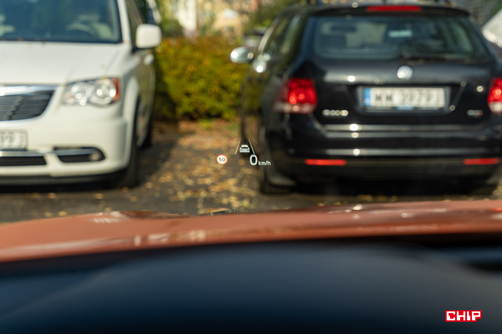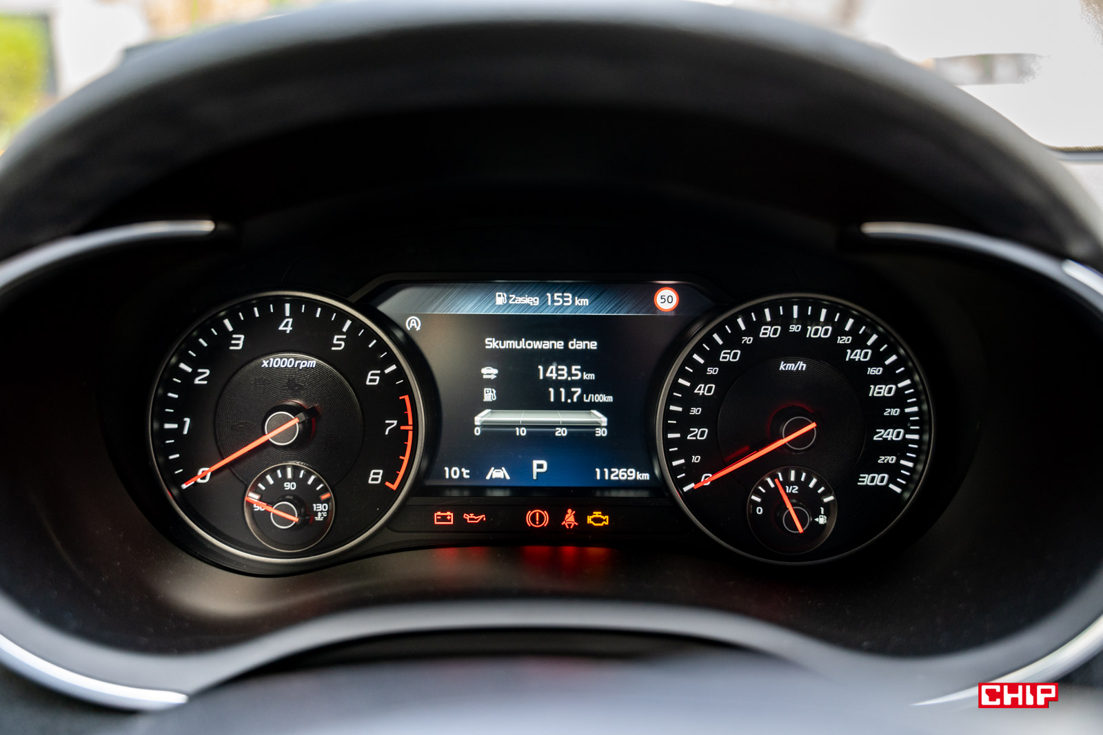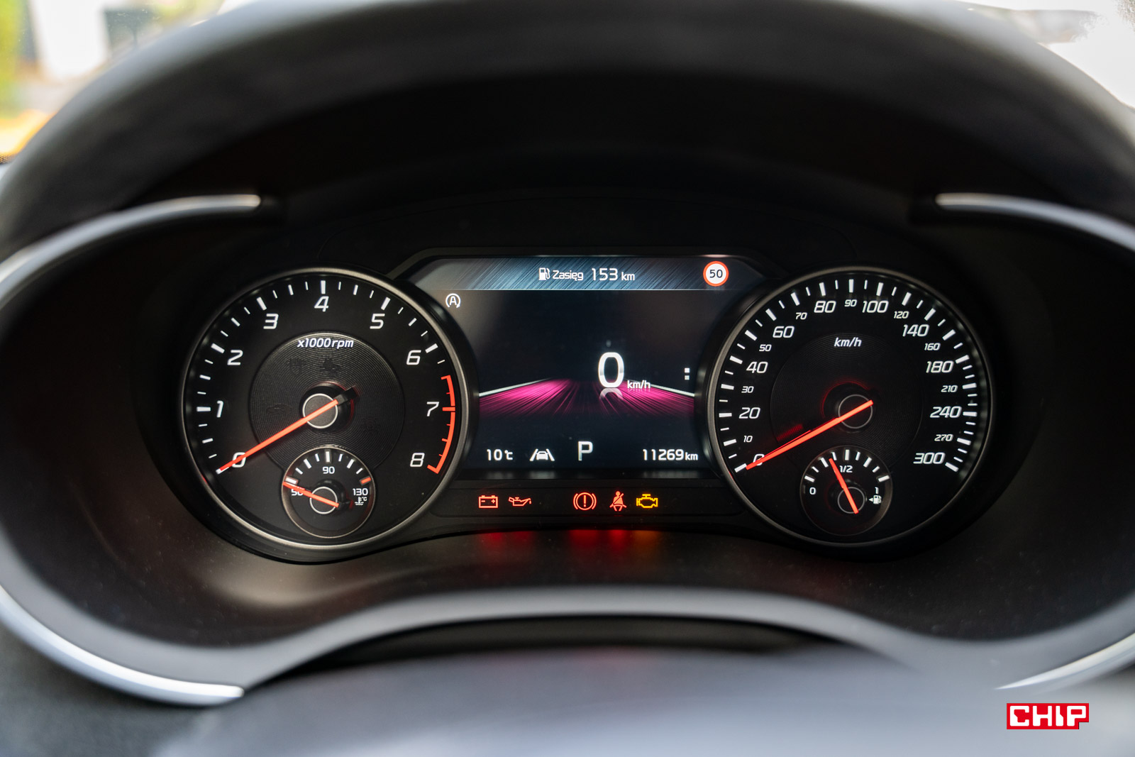 Ekran kierowcy jest nieduży nam na dzisiejsze standardy, ale czytelny i bardzo dobrej jakości. Na nim wyświetlane są informacje o podróży, czy niektórych aktualnie używanych funkcjach. Tam też pojawia się obraz z kamer na luterkach po włączeniu danego kierunkowskazu. Dopełnieniem ekranu jest czytelny wyświetlacz head-up.