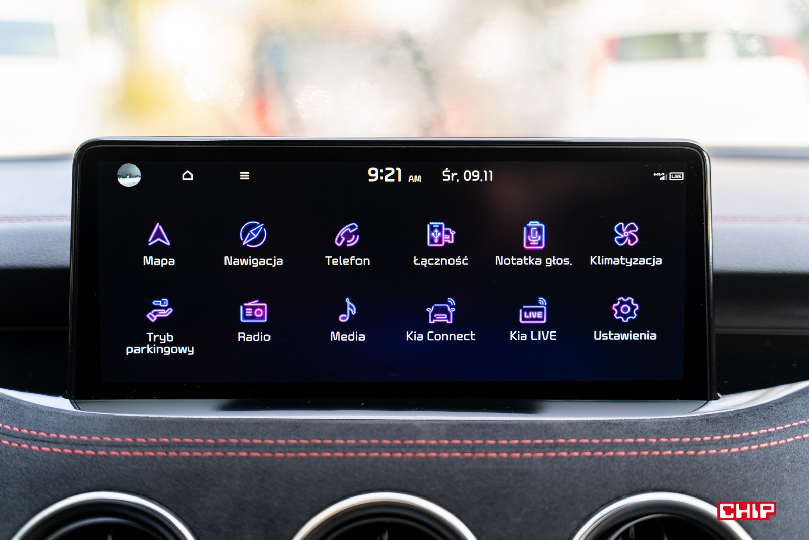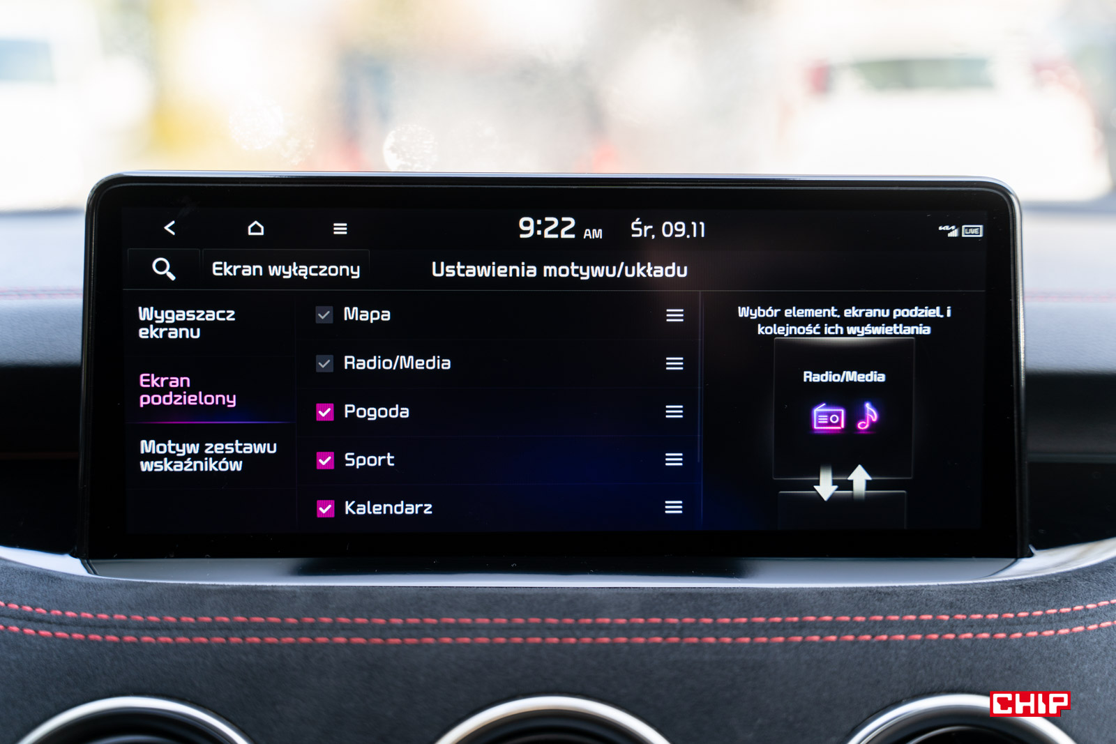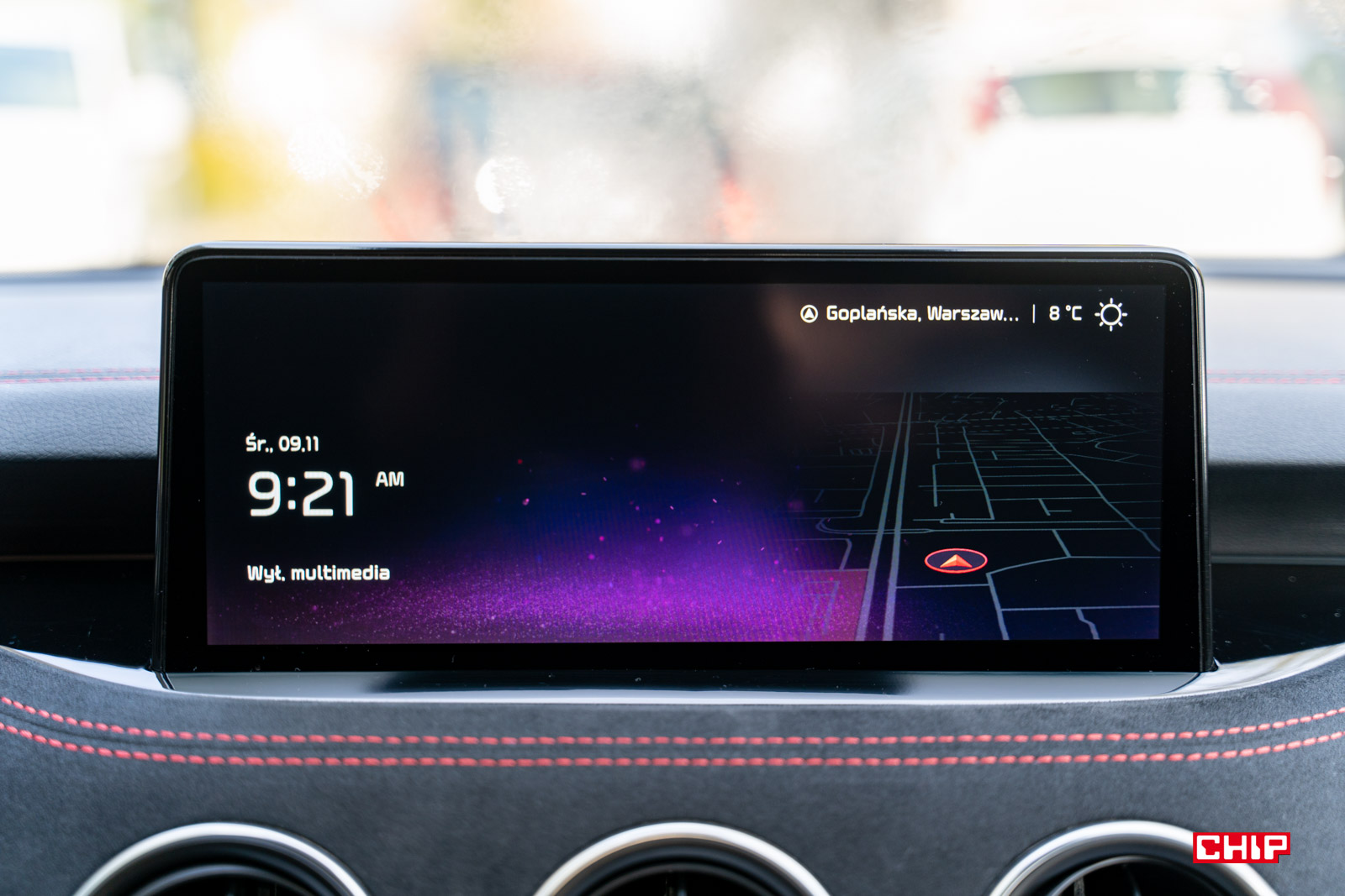 Interfejs jest bardzo dobry. Działa płynnie, a wszystkie opcje są intuicyjne i łatwe do znalezienia. Plus za dodanie skrótu do wyłączenia asystenta pasa w postaci fizycznego przycisku, który jest umieszczony na lewo od kierownicy. Wygląd interfejsu jest taki sam jak w innych nowych autach producenta. Ekran może być podzielony na dwie części – większą i mniejszą. Można na nim wyświetlać dwie funkcje jednocześnie. Podzielenie ekranu nie działa w przypadku Android Auto (połączenie tylko przewodowe). To znaczy działa, bo na ekranie widzimy aktualnie otwartą aplikację i obok szeroki pas na 1/5 powierzchni z informacją o… nazwie smartfonu. Przecież ja wiem, jaki mam model telefonu i zamiast tego wolałbym mieć mapę na pełnym ekranie, a w ogóle ideałem byłaby Mapa obok Tidala, jak w BMW. Czeka, aż w końcu KIA to zmieni.