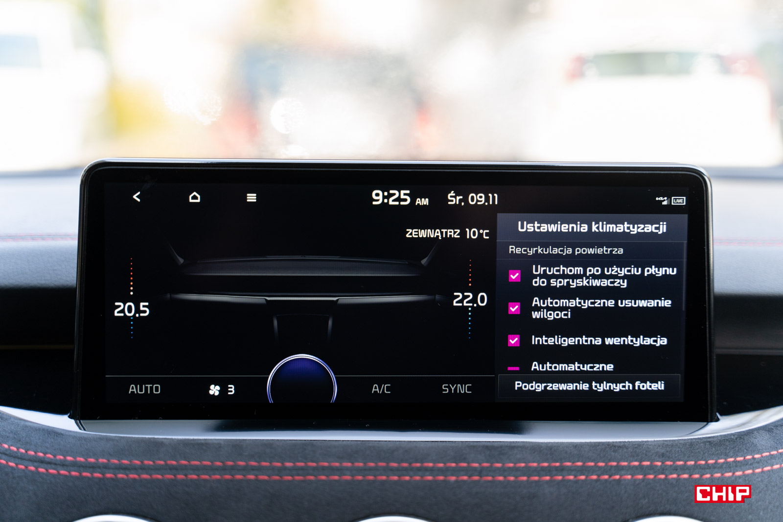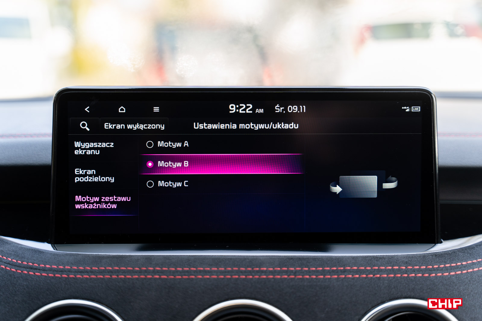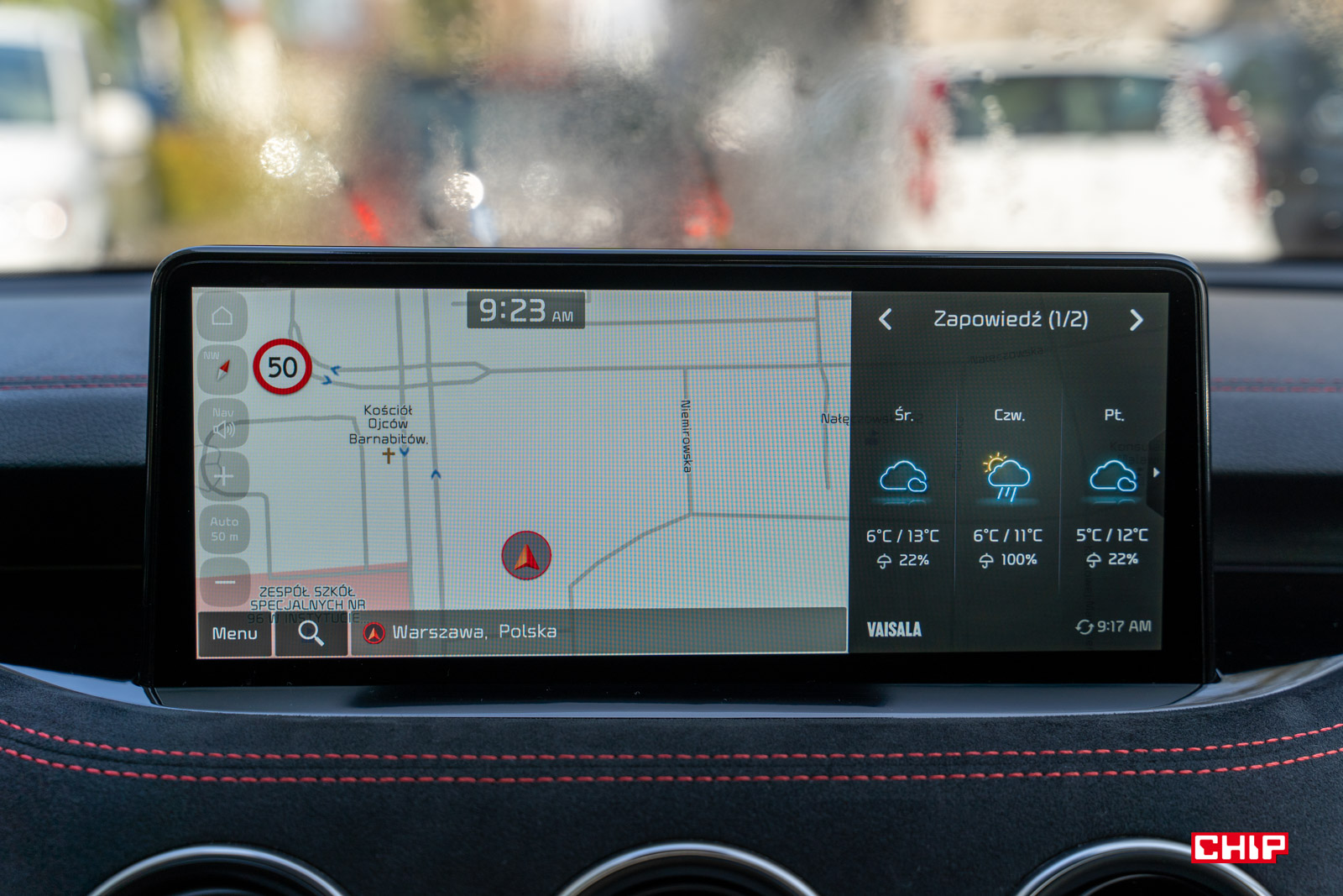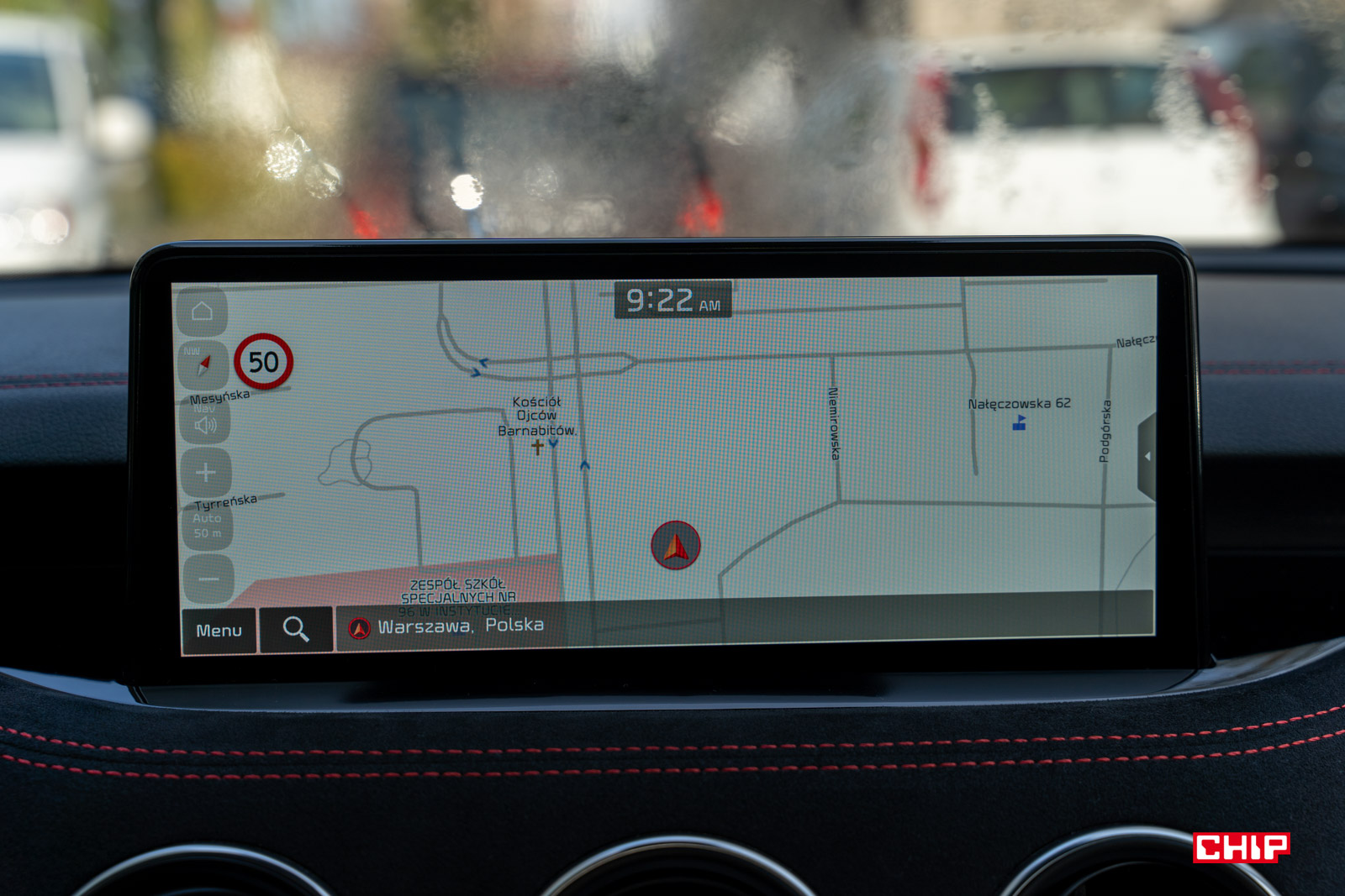 Interfejs jest bardzo dobry. Działa płynnie, a wszystkie opcje są intuicyjne i łatwe do znalezienia. Plus za dodanie skrótu do wyłączenia asystenta pasa w postaci fizycznego przycisku, który jest umieszczony na lewo od kierownicy. Wygląd interfejsu jest taki sam jak w innych nowych autach producenta. Ekran może być podzielony na dwie części – większą i mniejszą. Można na nim wyświetlać dwie funkcje jednocześnie. Podzielenie ekranu nie działa w przypadku Android Auto (połączenie tylko przewodowe). To znaczy działa, bo na ekranie widzimy aktualnie otwartą aplikację i obok szeroki pas na 1/5 powierzchni z informacją o… nazwie smartfonu. Przecież ja wiem, jaki mam model telefonu i zamiast tego wolałbym mieć mapę na pełnym ekranie, a w ogóle ideałem byłaby Mapa obok Tidala, jak w BMW. Czeka, aż w końcu KIA to zmieni.