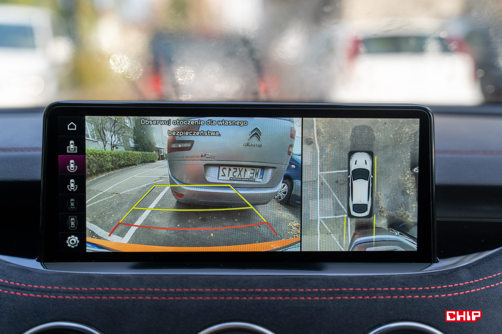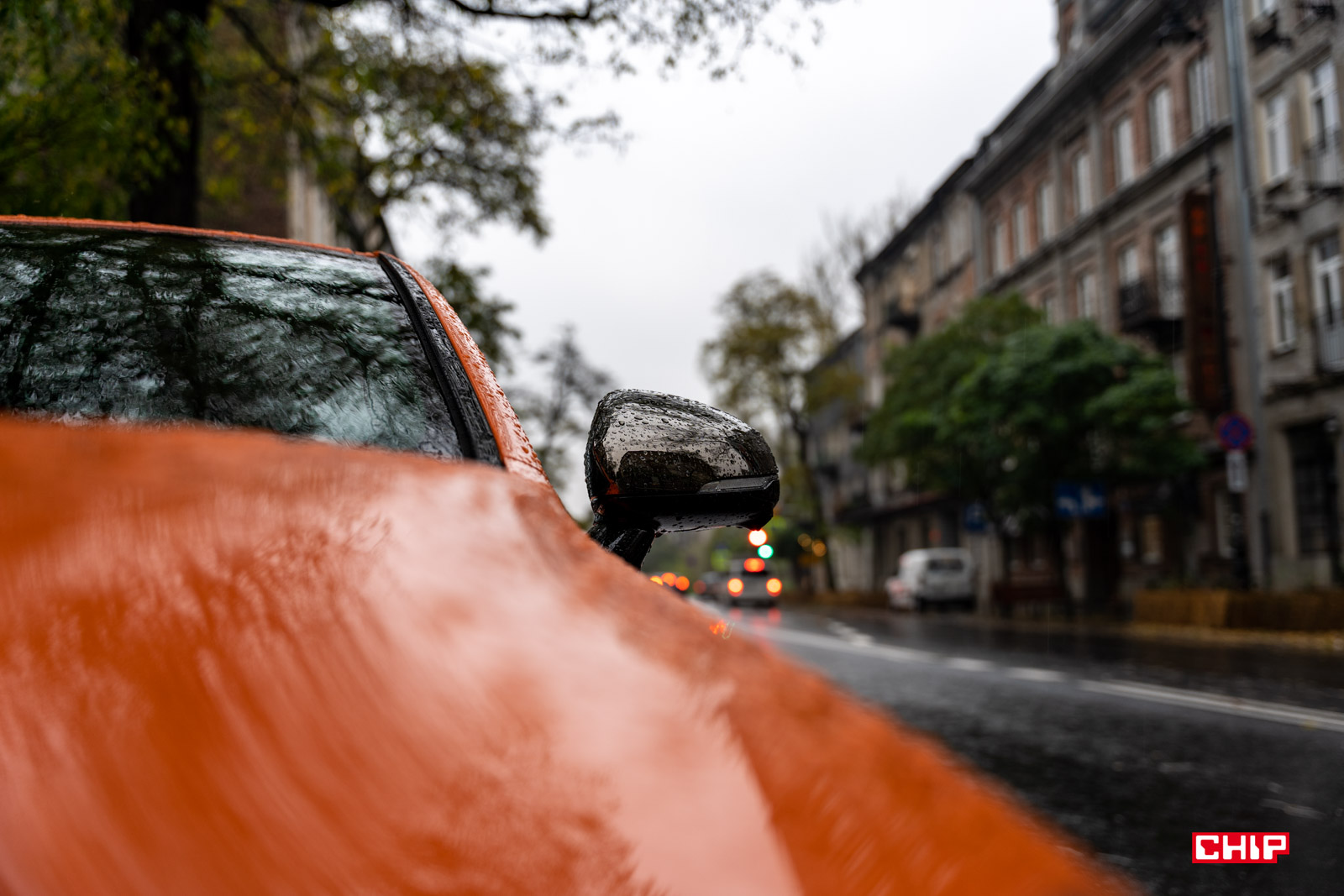 Kamera cofania ma jedną wadę, co widzicie na powyższym zdjęciu. Auto jest niskie, kamera też jest nisko, więc kiedy pada, obraz jest mocno przysłonięty kroplami wody.