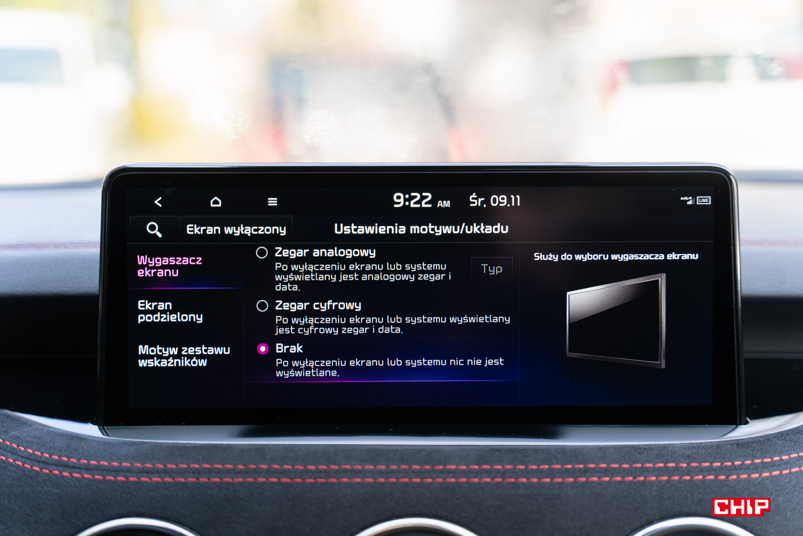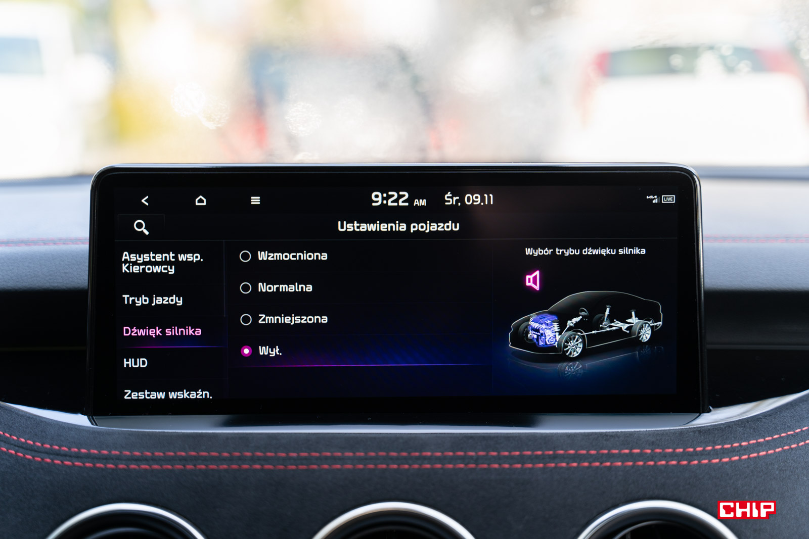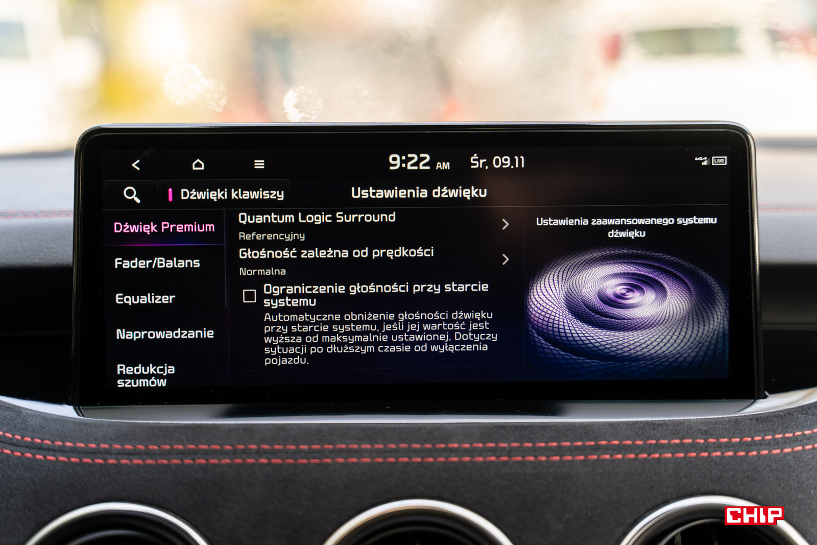 Kia Stinger GT ma solidne nagłośnienie. Delikatnie brakowało mi lepszego basu, ale ogółem jakość dźwięku stoi na bardzo dobrym poziomie. Wprawne oko zauważy, że pod fotelami również znajdują się głośniki. Ich główną rolą jest jednak… imitowanie odgłosów silnika. W Ustawieniach można tę funkcję włączyć lub wyłączyć. Podbity dźwięk jest miły dla ucha i bardzo efektowny. Taki wręcz żywcem wyjęty z Need for Speed. Po wyłączeniu podbicia pozostanie już tylko czysty dźwięk płynący z wydechu, ale już nie będzie do nas docierać niemal z każdej strony, a tylko z tyłu auta. Do tego będzie brzmieć o wiele cisze, za to naturalniej, ale spokojnie – jest czego posłuchać.