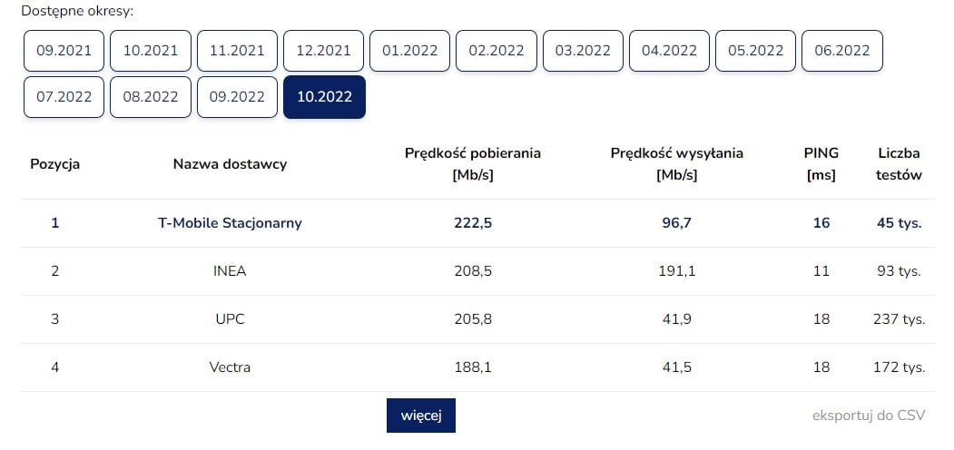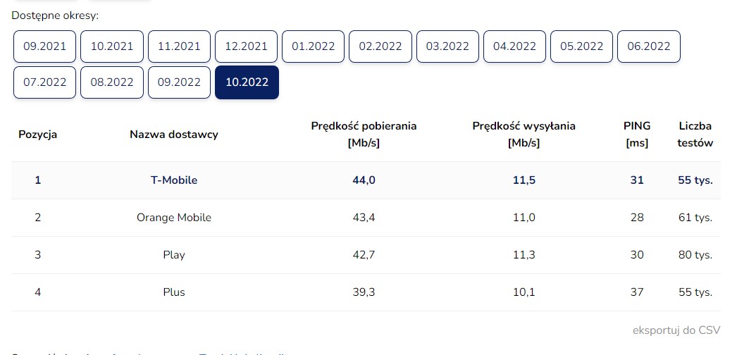 W kwestii połączeń komórkowych to również T-Mobile kontynuuje swoją dominację już czwarty miesiąc, zapewniając średnio 44 Mb/s pobierania i 11,5 Mb/s wysyłania przy 31-milisekundowym opóźnieniu. W tym zestawieniu liczba testów jest już zbliżona, więc wynik jest zdecydowanie dokładniejszy, ale patrząc na różnice w transferach i opóźnieniu, wcale nie są takie duże. Gdyby nie Plus i jego 39,3 Mb/s pobierania i 10,1 Mb/s wysyłania, Top 4 dostawców mobilnego Internetu miałoby bardzo zbliżone wyniki, bo zamykające się w różnicach ledwie kilku procent.