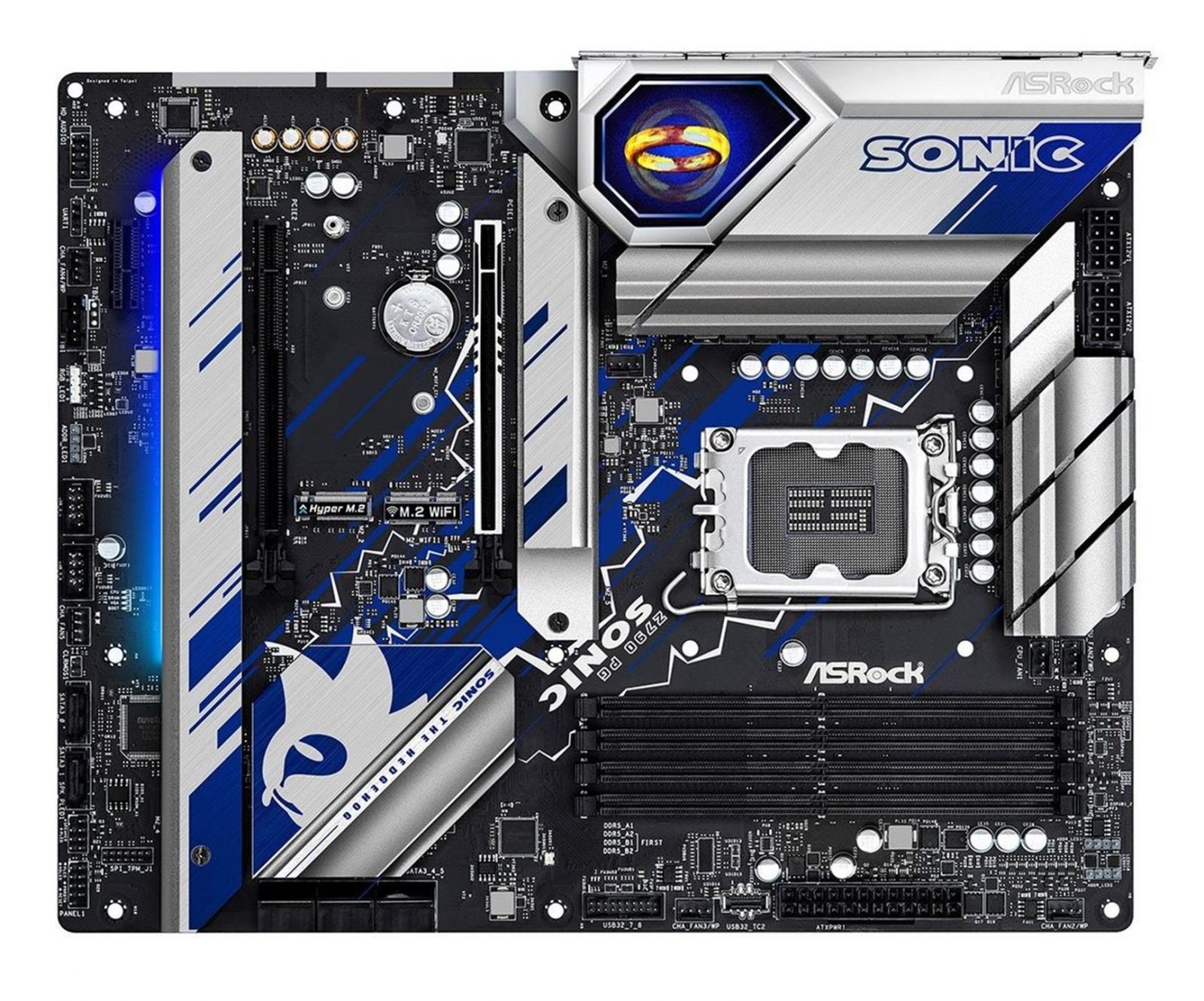 Płyta główna inspirowana Sonikiem dla procesorów Intel Core 13. i 12. generacji z wyższej półki doczekała się charakterystycznego błękitu na laminacie, radiatorach i tylnej zaślepce, a dodatkowo jeszcze bardziej jednoznacznych napisów oraz wizerunków. Tak jak jedna wizualizacja pyszczka Sonica pojawiła się na chłodzeniu chipsetu, tak druga (znacznie większa, przedstawiająca całą już postać) już z tyłu laminatu. Wisienką na torcie jest złoty krążek z powidokiem symulującym jego charakterystyczny ruch w grze na chłodzeniu sekcji zasilania.