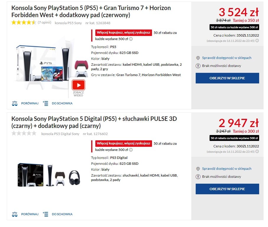 Na “wejście do PlayStationowego VR” możecie więc wydać całe 3548 złotych, a jeśli nie macie jeszcze konsoli PlayStation, czeka was wydatek rzędu prawie 2947 złotych, bo tyle w tej samej sieci kosztuje najtańsza oferta (PS5 Digital + słuchawki Pulse 3D i dodatkowy kontroler). Bardziej bogate wersje z napędem Blu-Ray to już wydatek rzędu 3524 zł, a to tylko z racji trwającej promocji, bo bez niej cena ta zostanie wywindowana do 3874 zł. Trudnie jest życie gracza, czyż nie?