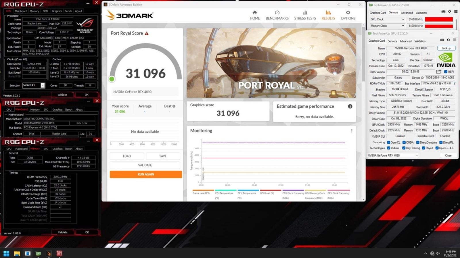 Dzięki takiemu pokładowi mocy overclockerzy byli w stanie wnieść model na wyżyny, korzystając oczywiście z ciekłego azotu, aby podbić taktowanie do rekordowego poziomu 3,7 GHz. Pomyślicie pewnie, że pozwoliło to pobić wszystkie rekordy świata w zakresie wydajności graficznej? No cóż – i tak i nie, bo na takiej częstotliwości RTX 4090 zaczął wręcz “świrować” i w efekcie jego wynik wydajności był niższy, niż oczekiwano. Wystarczyło jednak obniżyć taktowanie do 3570 MHz, aby rdzeń graficzny pracował tak, jak należy, co pozwoliło zdobyć 31096 punktów w benchmarku 3DMark Port Royal. To nowy światowy rekord, pobijający poprzedni o ponad 100 punktów.