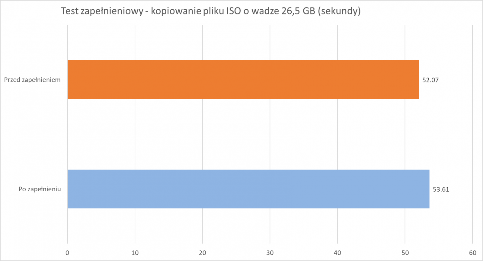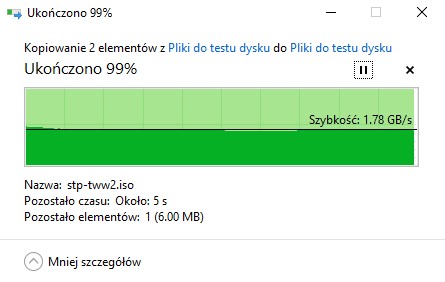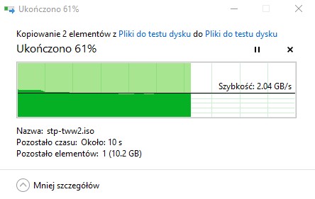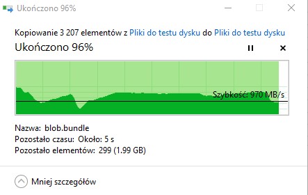 Syntetyczne, jak i praktyczne testy potwierdzają spadek wydajności dysku Kingston FURY Renegade 2 TB po zapełnieniu do ~95%. Nie są to duże spadki, ale można je z łatwością zauważyć m.in. przy kopiowaniu dużej liczby mniejszych plików. Najbardziej widać to przy kopiowaniu pliku ISO.