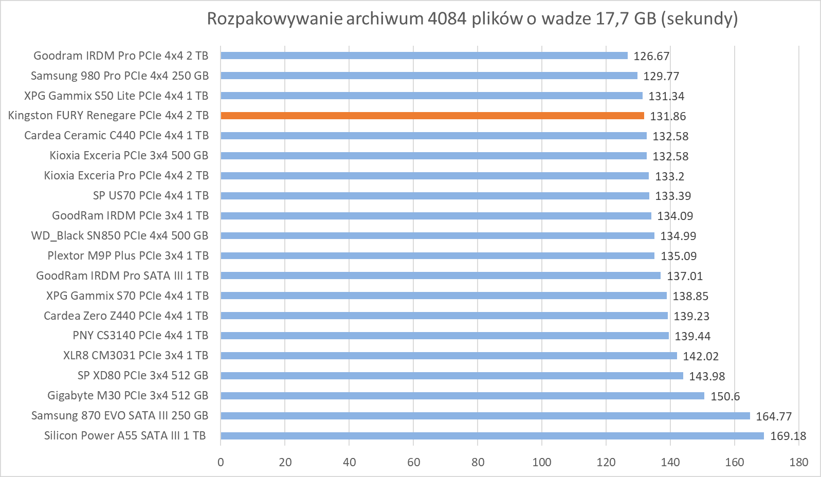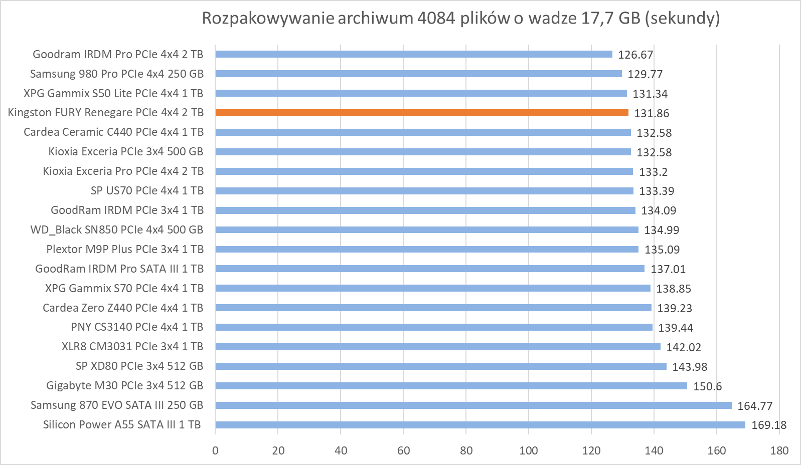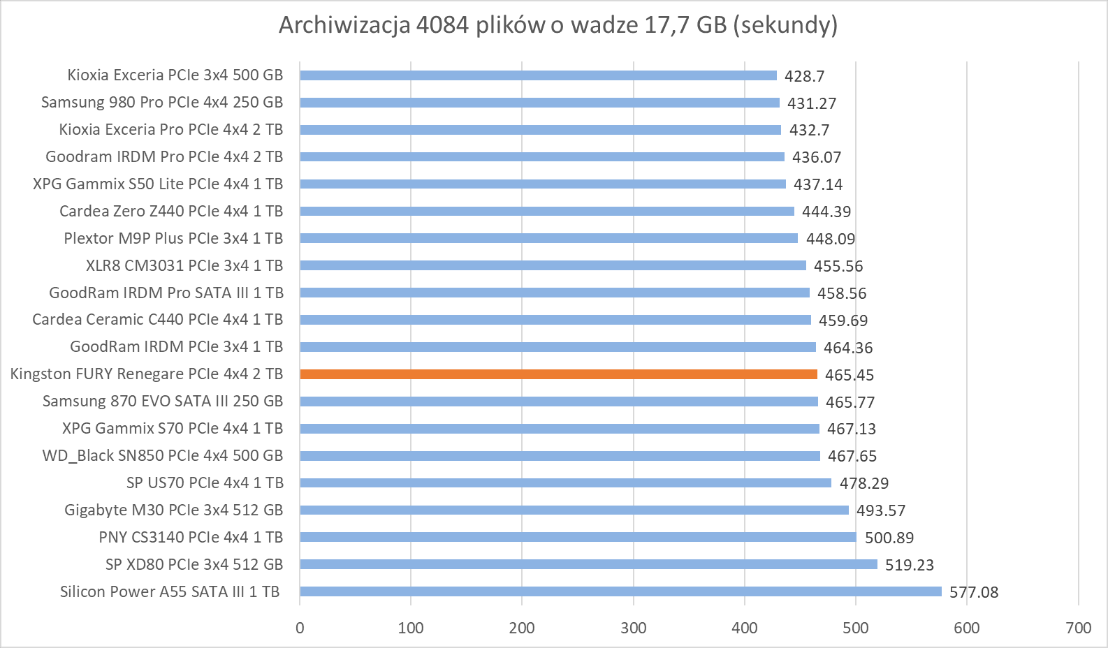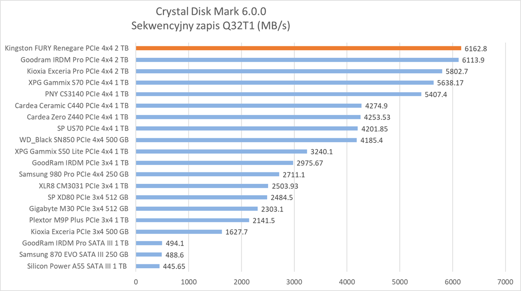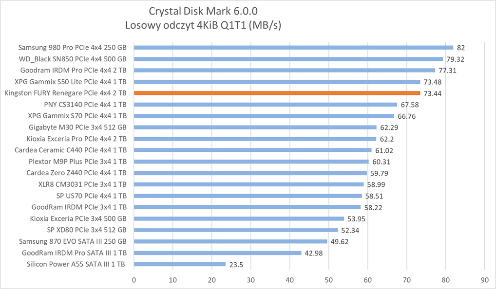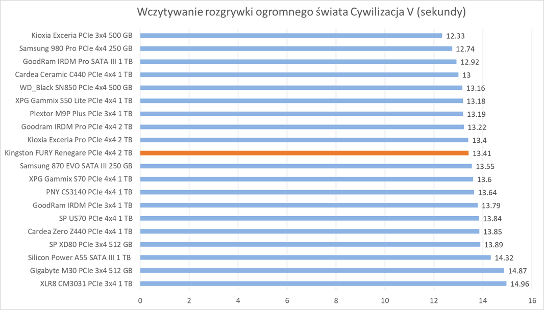 Ogólne możliwości Kingston FURY Renegade 2 TB potwierdzają bardziej praktyczne testy z udziałem rzeczywistych programów. Wprawdzie wykresy nie sugerują tego, że dysk oferuje wyższą wydajność względem innych modeli, ale zwróćcie szczególną uwagę na wyniki – różnice sprowadzają się zwykle do kilku, góra kilkunastu procent.