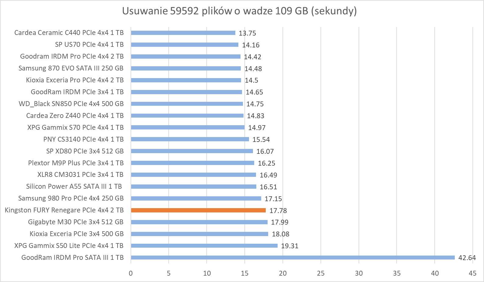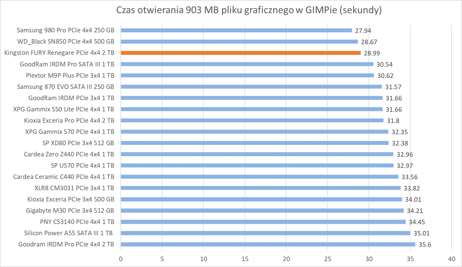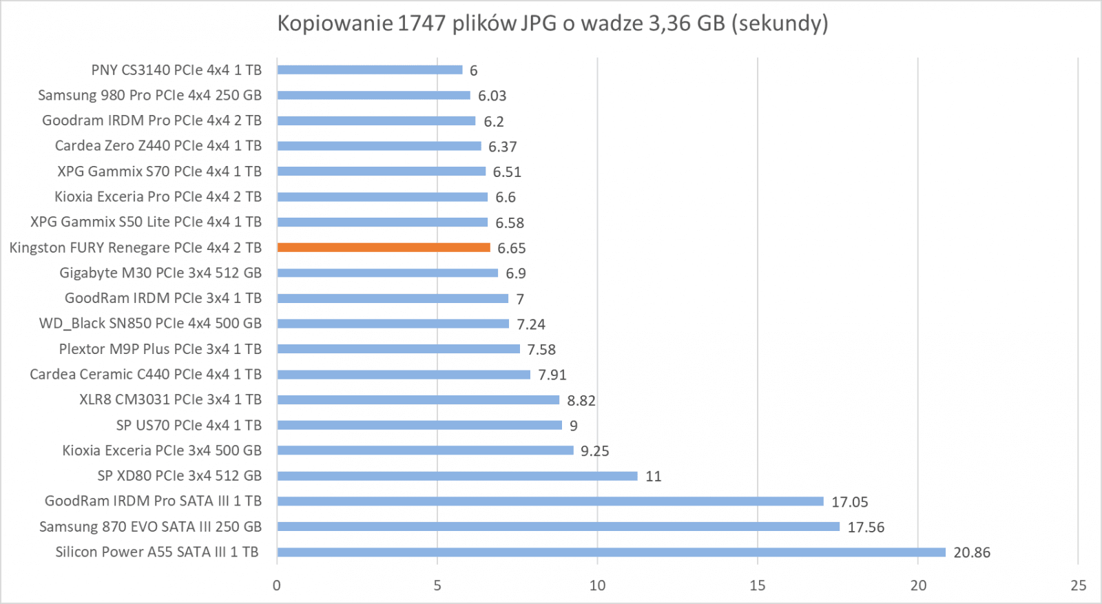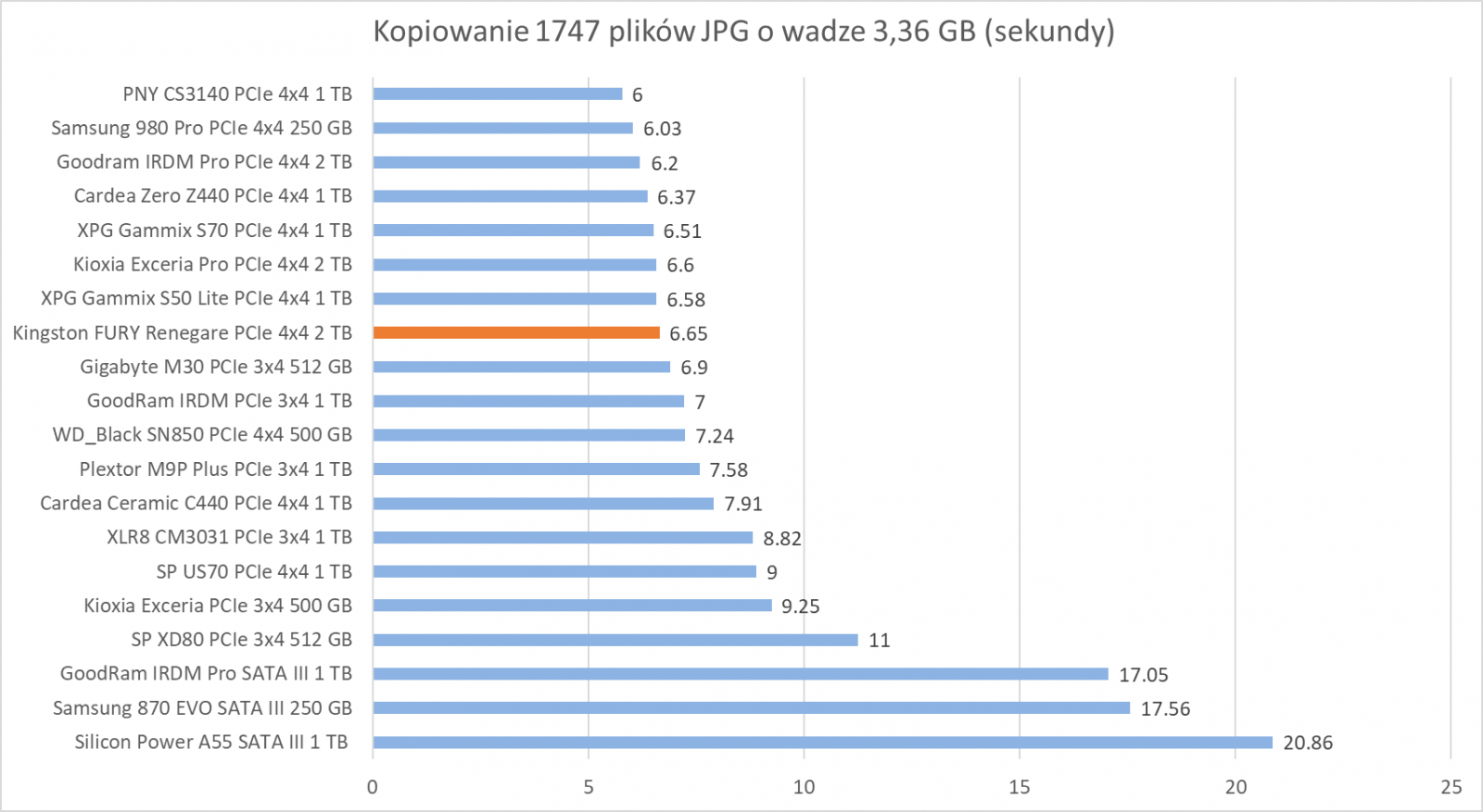 Ogólne możliwości Kingston FURY Renegade 2 TB potwierdzają bardziej praktyczne testy z udziałem rzeczywistych programów. Wprawdzie wykresy nie sugerują tego, że dysk oferuje wyższą wydajność względem innych modeli, ale zwróćcie szczególną uwagę na wyniki – różnice sprowadzają się zwykle do kilku, góra kilkunastu procent.