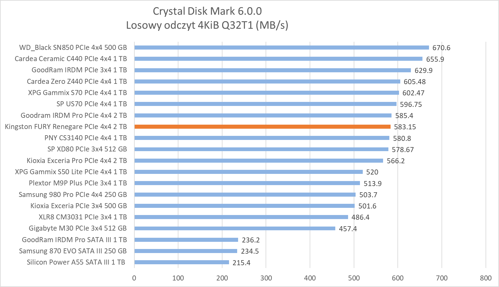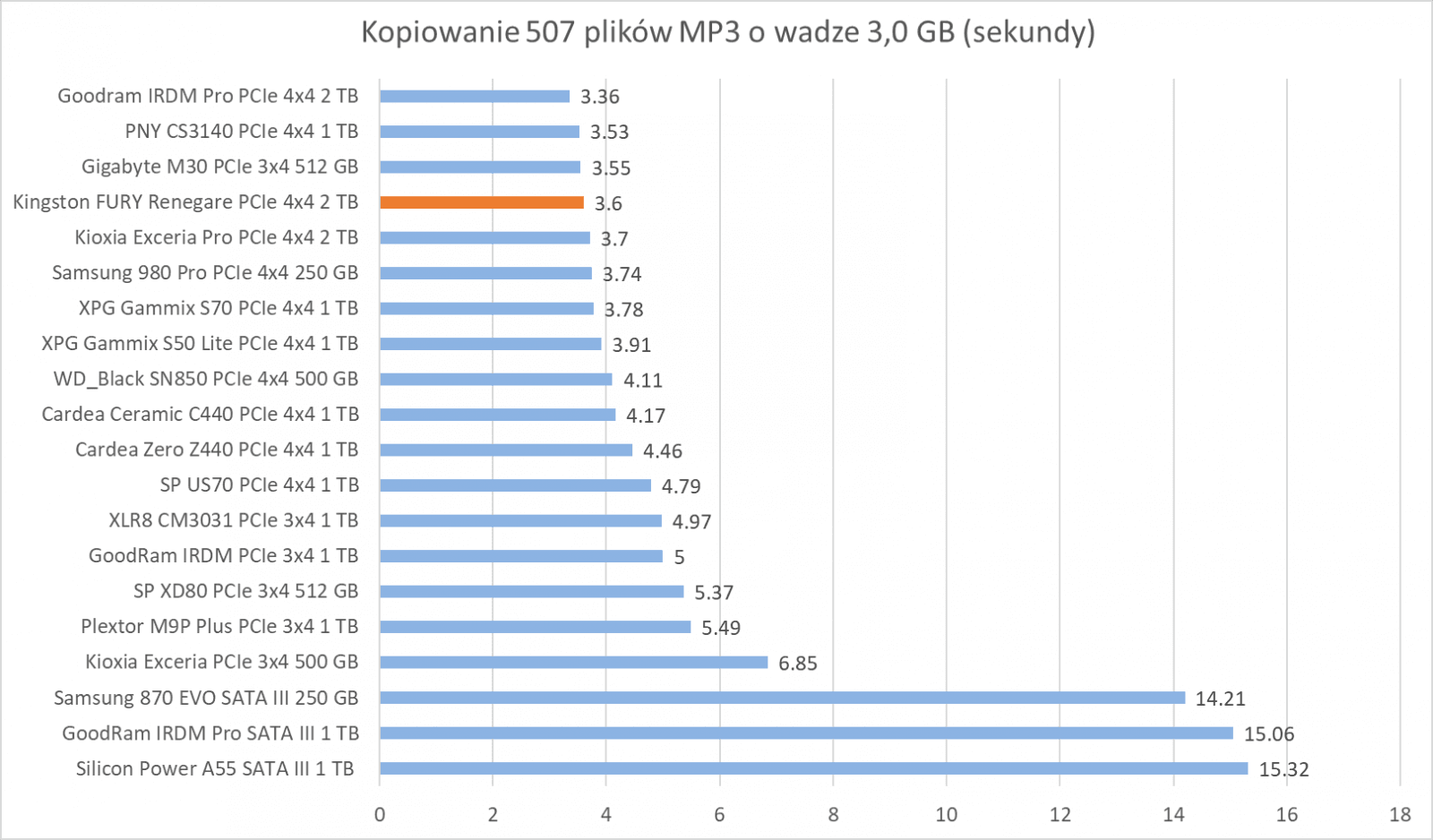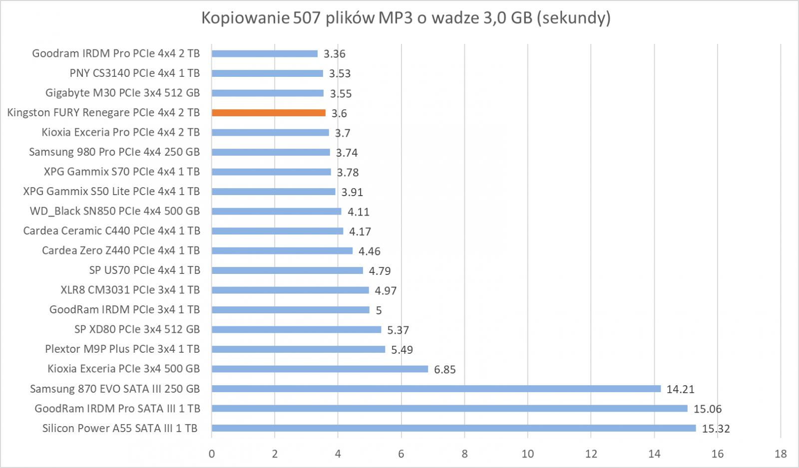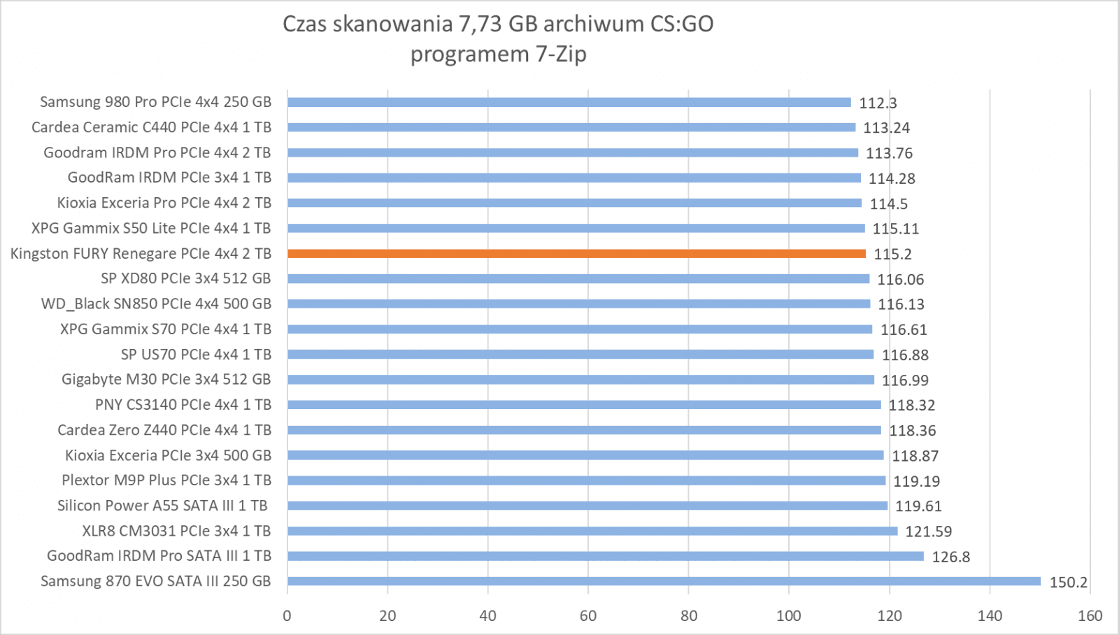 Ogólne możliwości Kingston FURY Renegade 2 TB potwierdzają bardziej praktyczne testy z udziałem rzeczywistych programów. Wprawdzie wykresy nie sugerują tego, że dysk oferuje wyższą wydajność względem innych modeli, ale zwróćcie szczególną uwagę na wyniki – różnice sprowadzają się zwykle do kilku, góra kilkunastu procent.