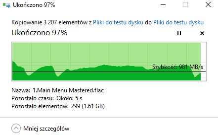 Spadki są potwierdzane przez wykresy z samego kopiowania, które przedstawiają zmieniający się transfer w ciągu całego procesu kopiowania plików: