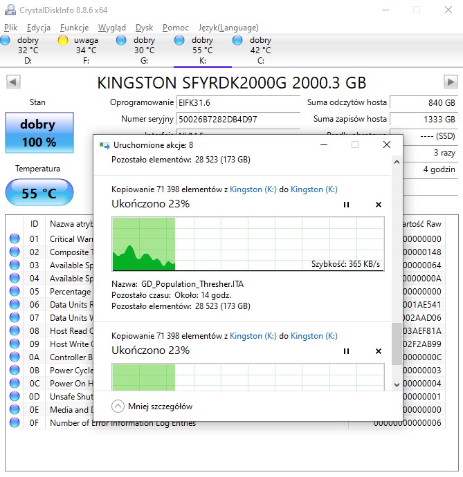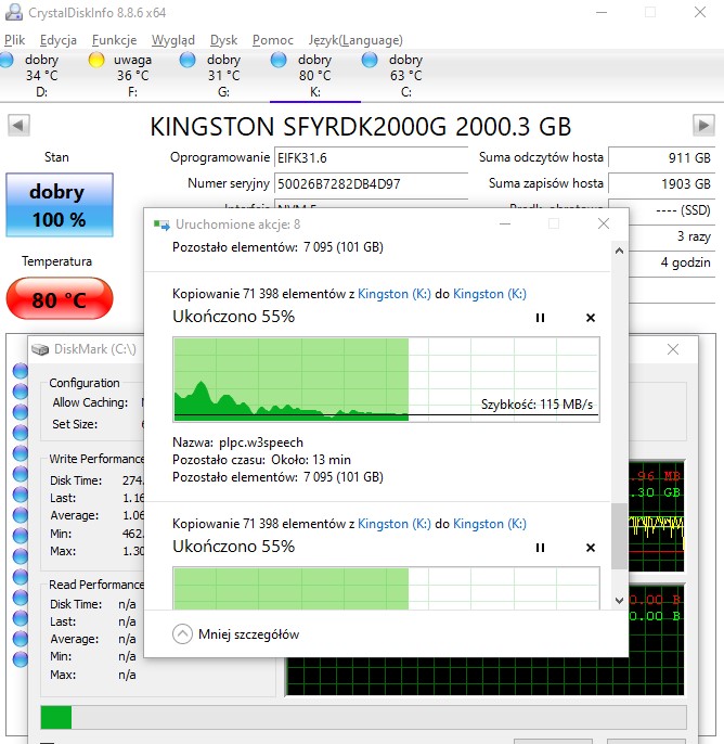 Chłodzenie Kingston FURY Renegade 2 TB ewidentnie jest odpowiednie, co pozwoliło mi przeprowadzić test bez stosowania dodatkowego chłodzenia. Przynajmniej, jeśli idzie o tradycyjne, codzienne wykorzystanie dysku, bo wtedy dysk rozgrzewa się do około 55-60 stopni Celsjusza. Jeśli jednak zarzucimy dyskowi znacznie większe obciążenie (kopiowanie + stress test), jego temperatura dobije do 80 stopni i wtedy dysk zacznie ograniczać swoją wydajność (aktywując funkcję Thermal-Throttlingu), aby nie ulec uszkodzeniu.