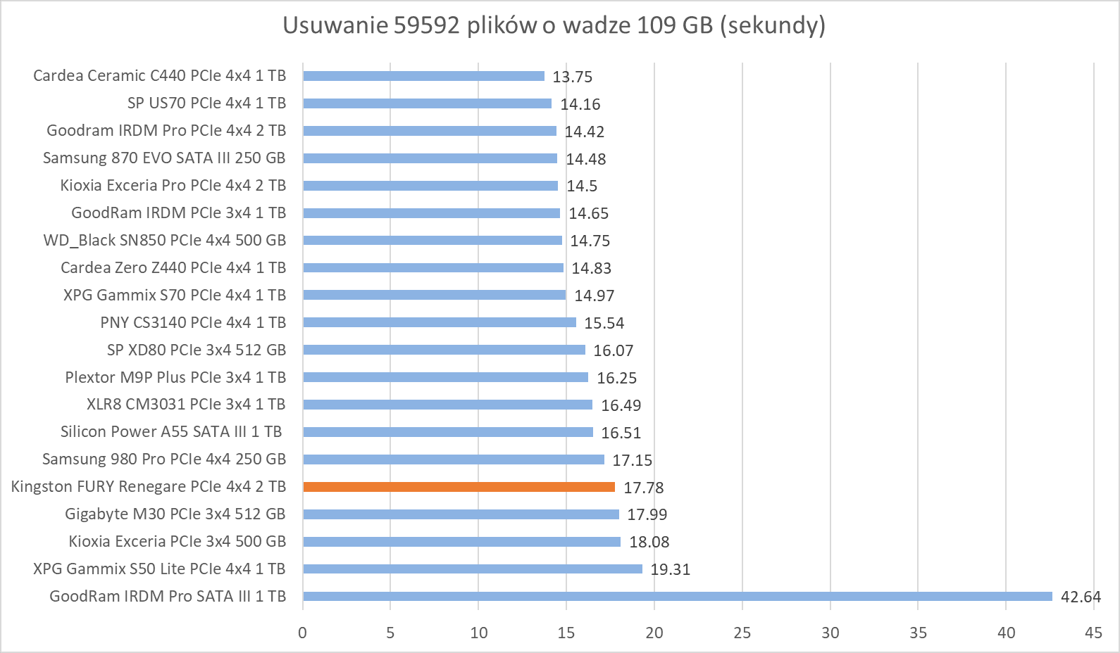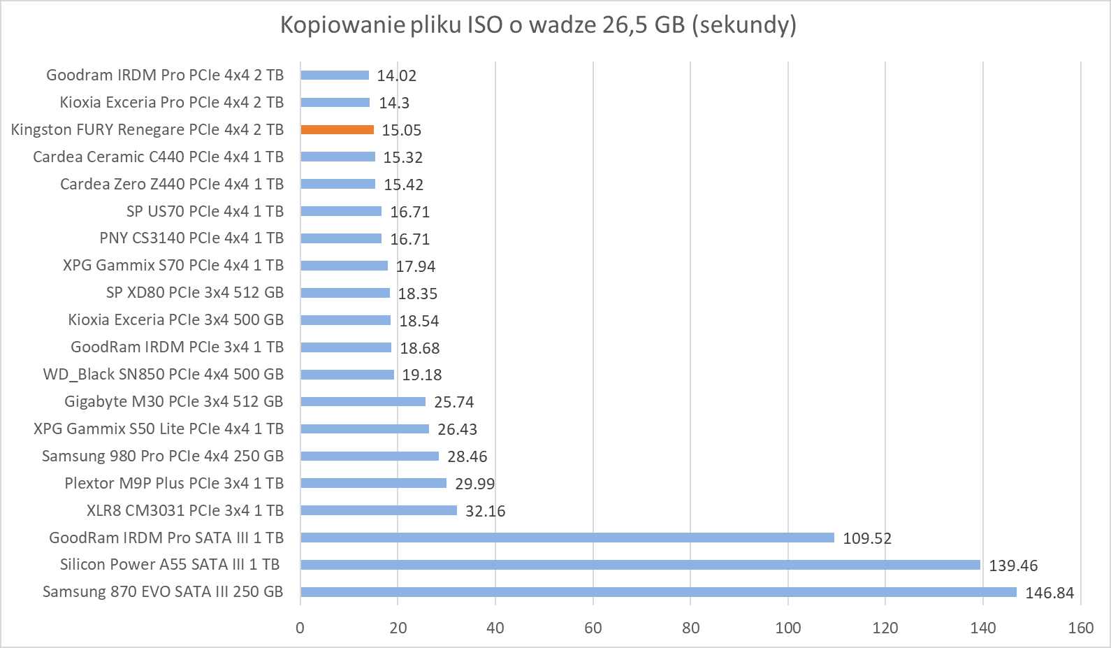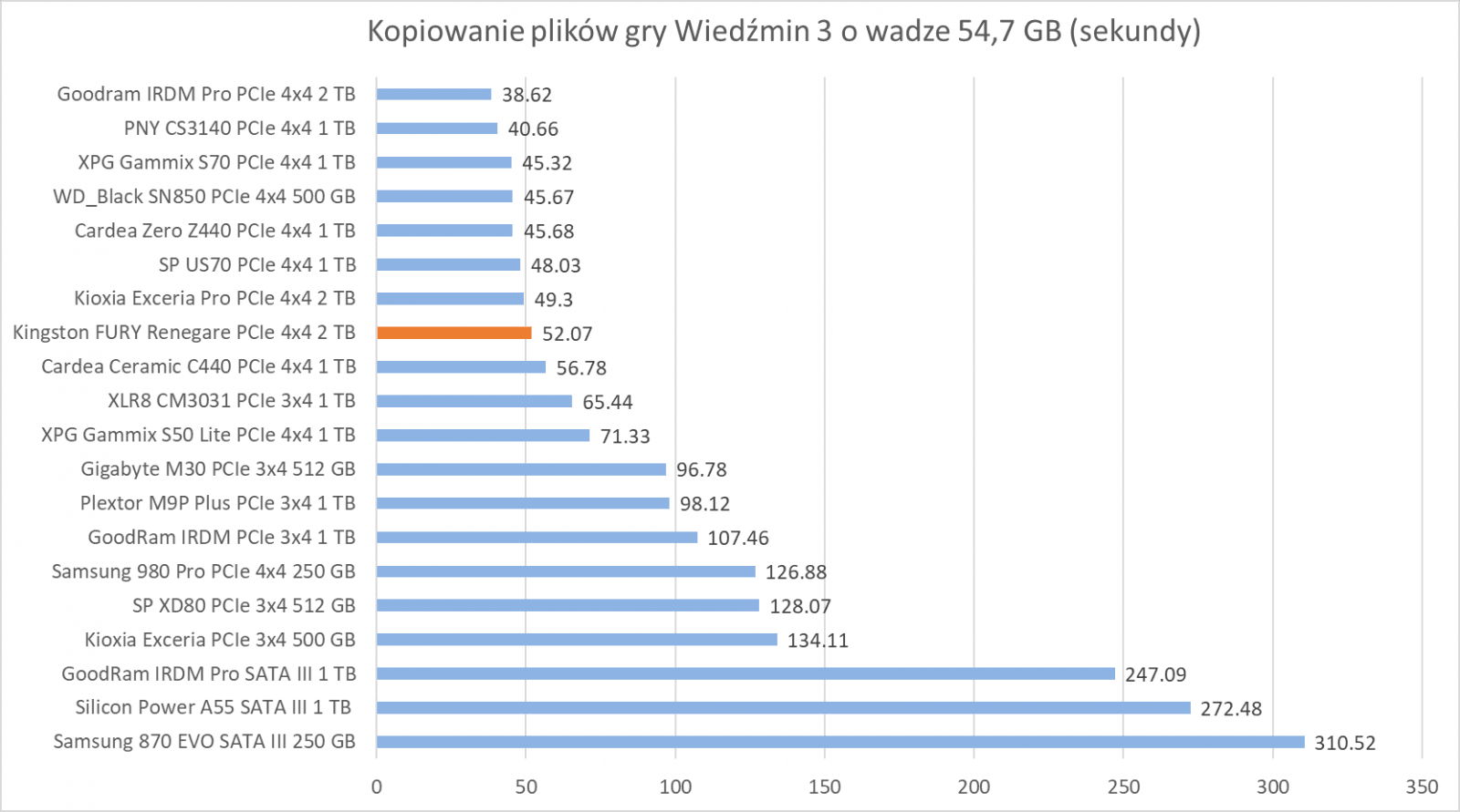Kingston FURY Renegade 2 TB wypada przyzwoicie na tle innych modeli, radząc sobie świetnie w kopiowaniu plików, dorównując innym podobnym dyskom tej klasy.