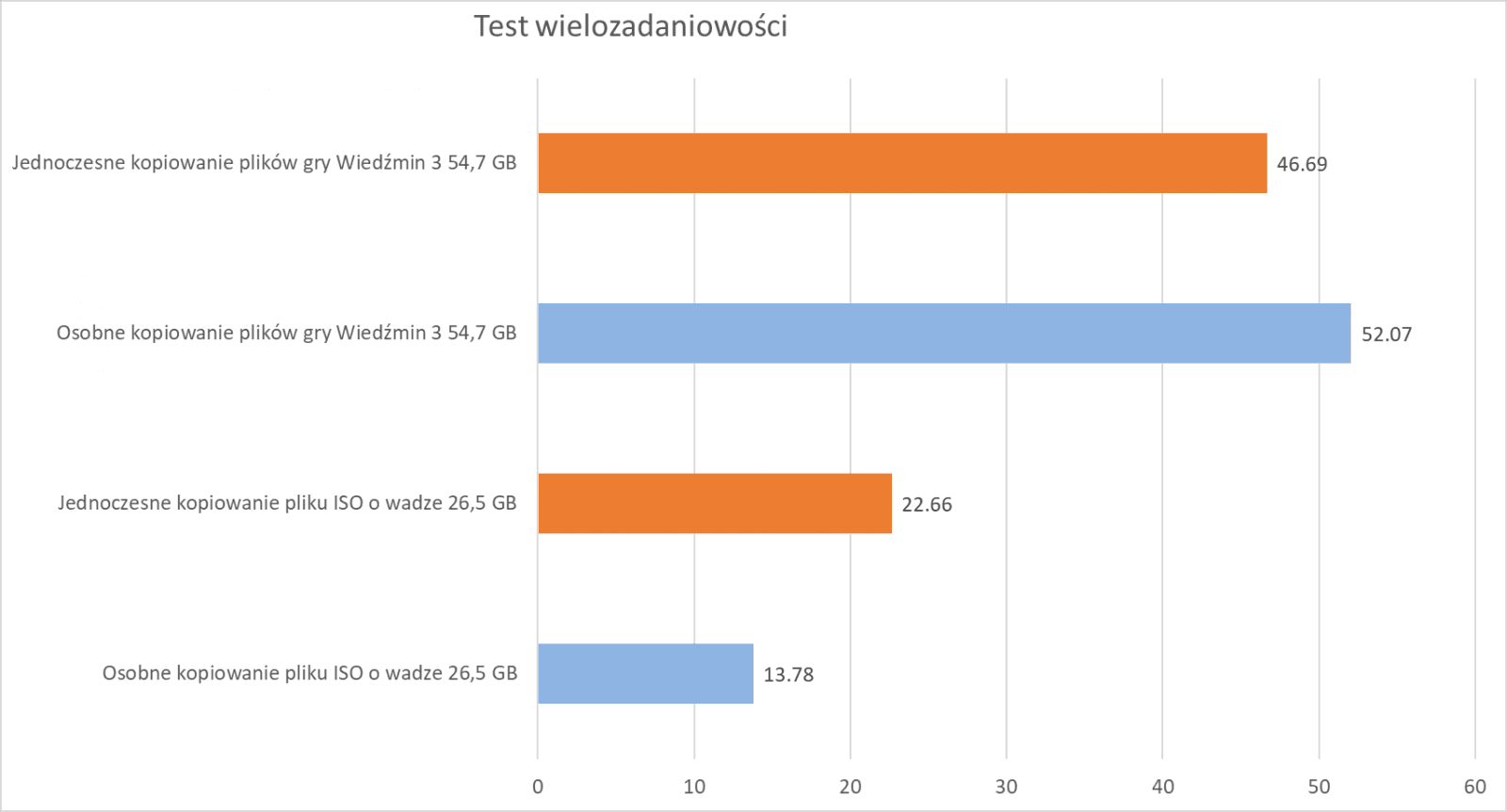 Test wielozadaniowości ujawnił arcyciekawy przypadek, kiedy to jednoczesne kopiowanie plików skróciło kopiowanie plików. Dzięki temu kopiowanie Wiedźmina 3 zostało skrócone z 52.07 do 46.69 sekund, ale jednocześnie kopiowanie ISO wydłużyło się o około 9 sekund. W efekcie oszczędność czasu wyniosła wzorowe 19 sekund (65,85 vs 46,69 sekund).