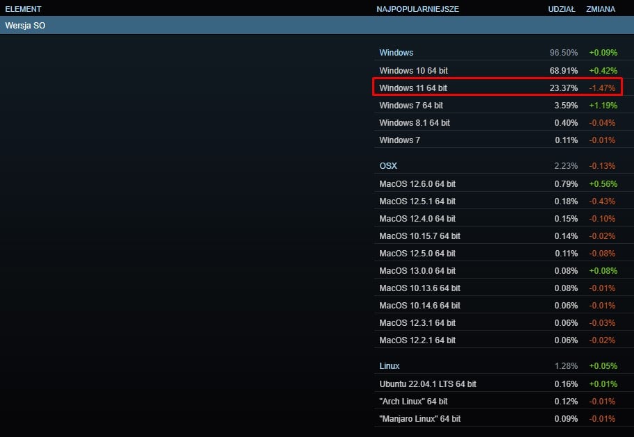 Jeszcze w październiku pisaliśmy o tym, jak to Windows 11 zyskuje popularność wśród graczy, zyskując coraz więcej udziałów na rynku. Comiesięczne wzrosty o około procent trwały długo, ale nie mogły być wieczne. Zwłaszcza na tle ostatnich wiadomości oraz poradników, które bezpośrednio sugerowały użytkownikom Windowsa 11 powrót albo do aktualizacji sprzed 22H2, albo wręcz na Windowsa 10, który zresztą jest mniej wymagający i tym samym zżera mniej energii.