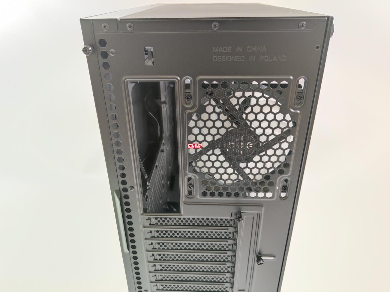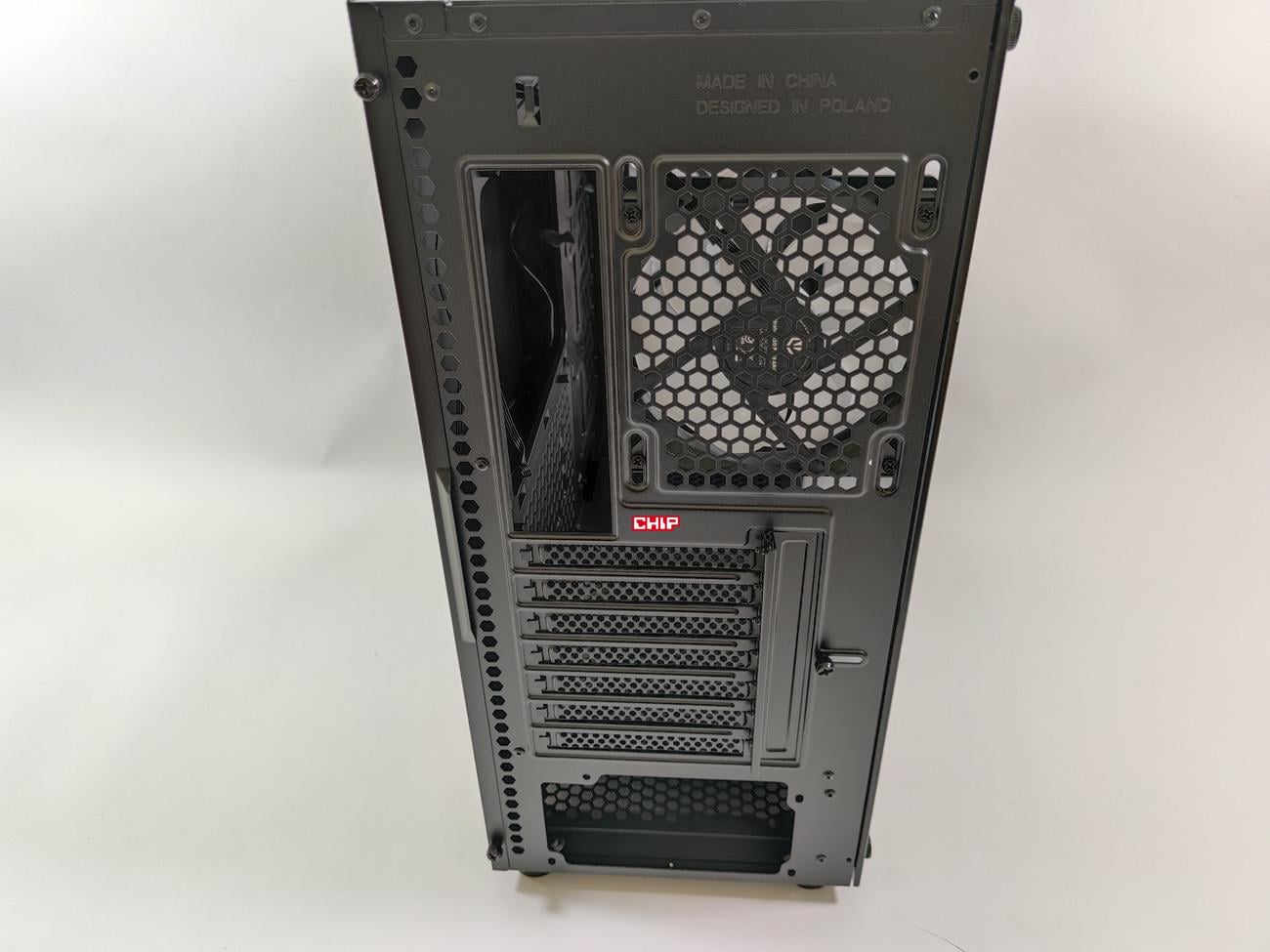 Z tyłu ponownie nie ma zaskoczenia. Na dole jest miejsce na zasilacz, wyżej 7 zaślepek PCI mocowanych na śrubki, a na górze jest 120 mm wentylator. Model to dokładnie ten sam co z przodu.