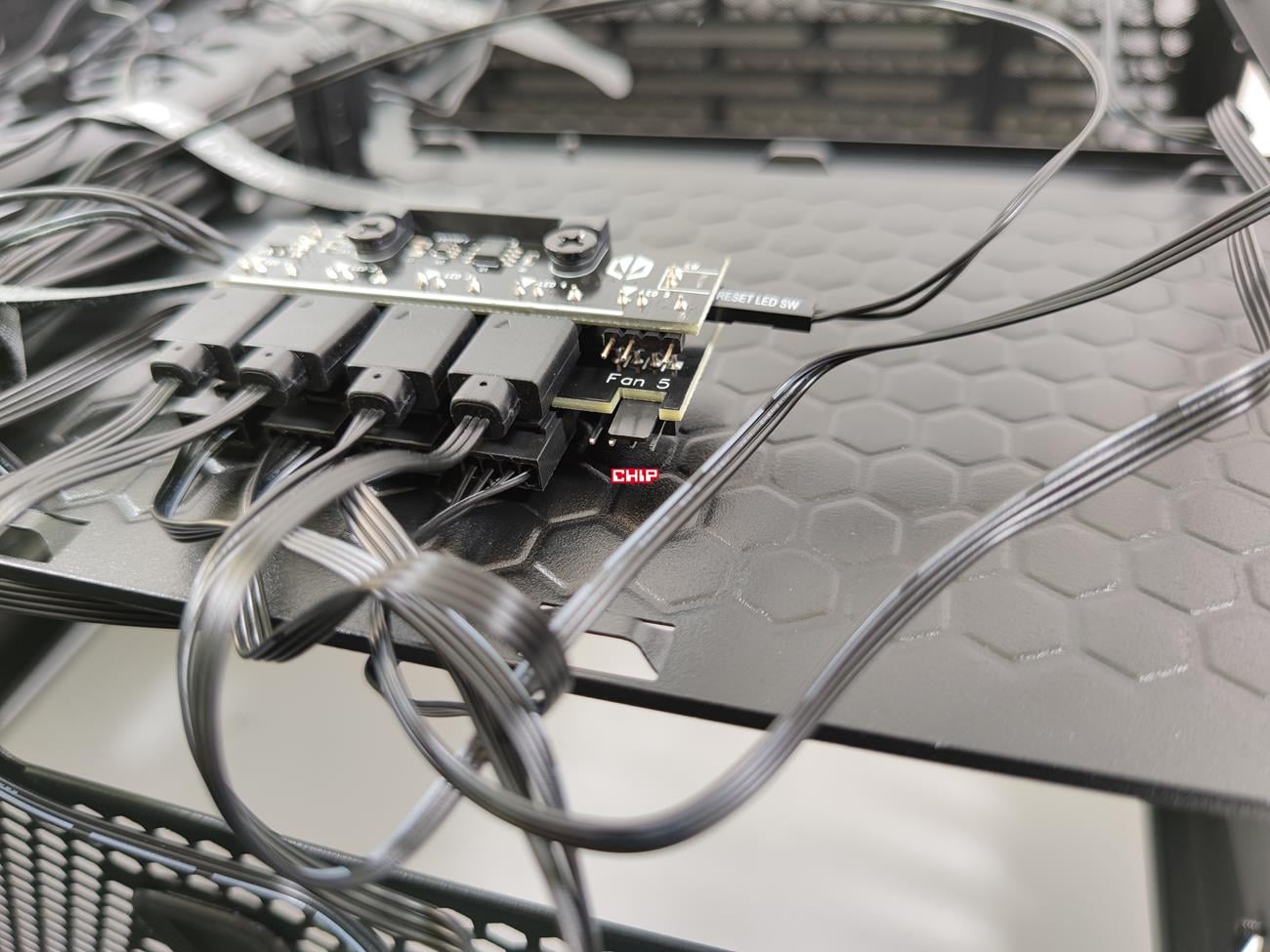 W obudowie znajduje się kontroler, do którego podłączacie wentylatory. Jest on dwuwartstwowy – na zewnątrz są złącza ARGB, pod nimi 4-pin (w obu przypadkach mamy jeszcze jedno miejsce wolne). Zasilanie odbywa się ze złącza SATA. Kontroler możecie podłączyć pod złącze ARGB i PWM na płycie. Praca wentylatorów będzie więc sterowana przez płytę główną. W przypadku ARGB możecie nim sterować przyciskiem umieszczonym na górze obudowy, albo zdecydować się na oprogramowanie producenta płyty.