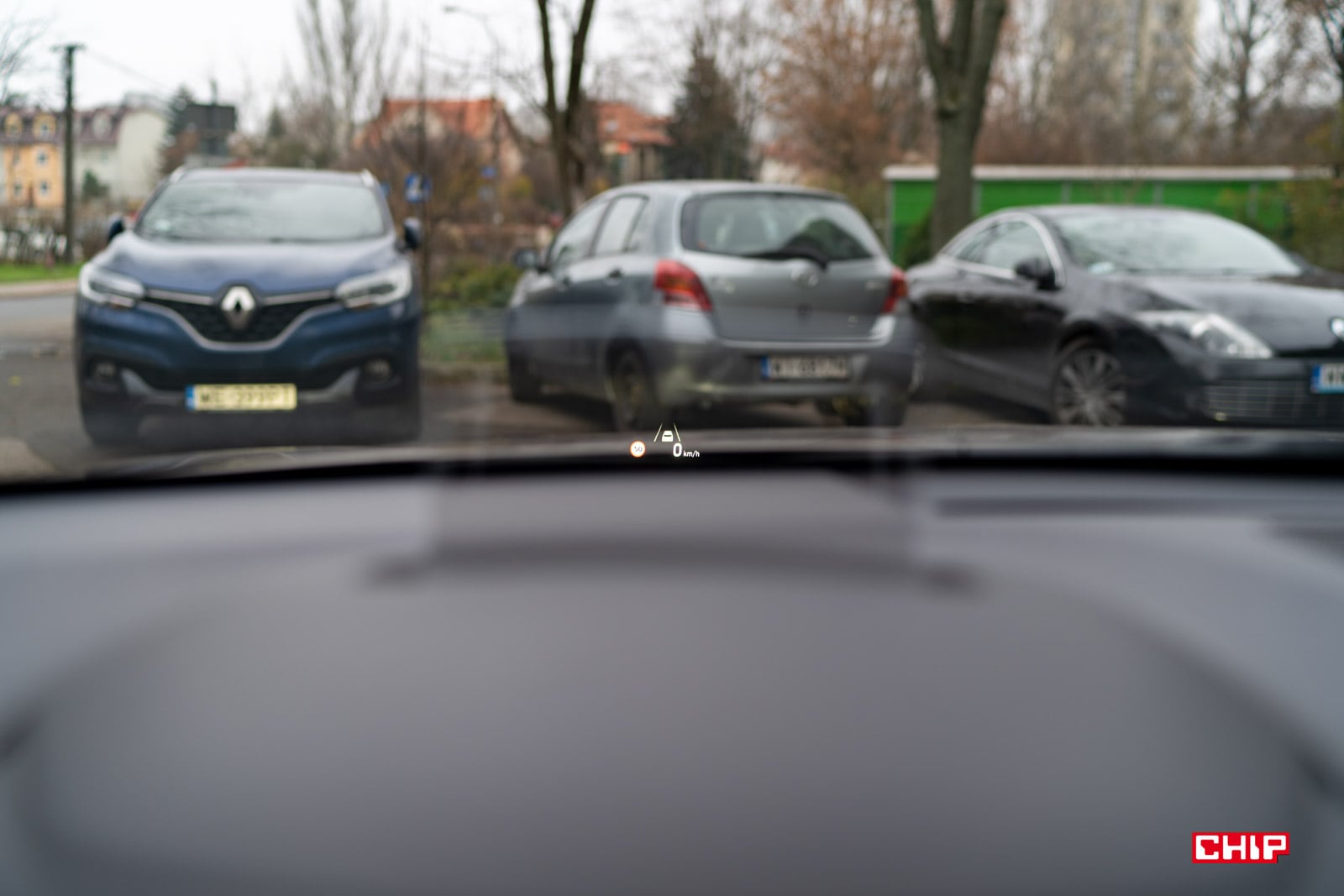 Auto zostało wyposażone w chowany ekran heads-up. Uruchamiamy go przyciskiem na lewo od kierownicy, a on zaczyna się wysuwać. Niektórzy narzekają na takie konstrukcje, a ja zawsze powtarzam, że HUD lepiej mieć, niż go nie mieć. W jakiej formie by nie był.