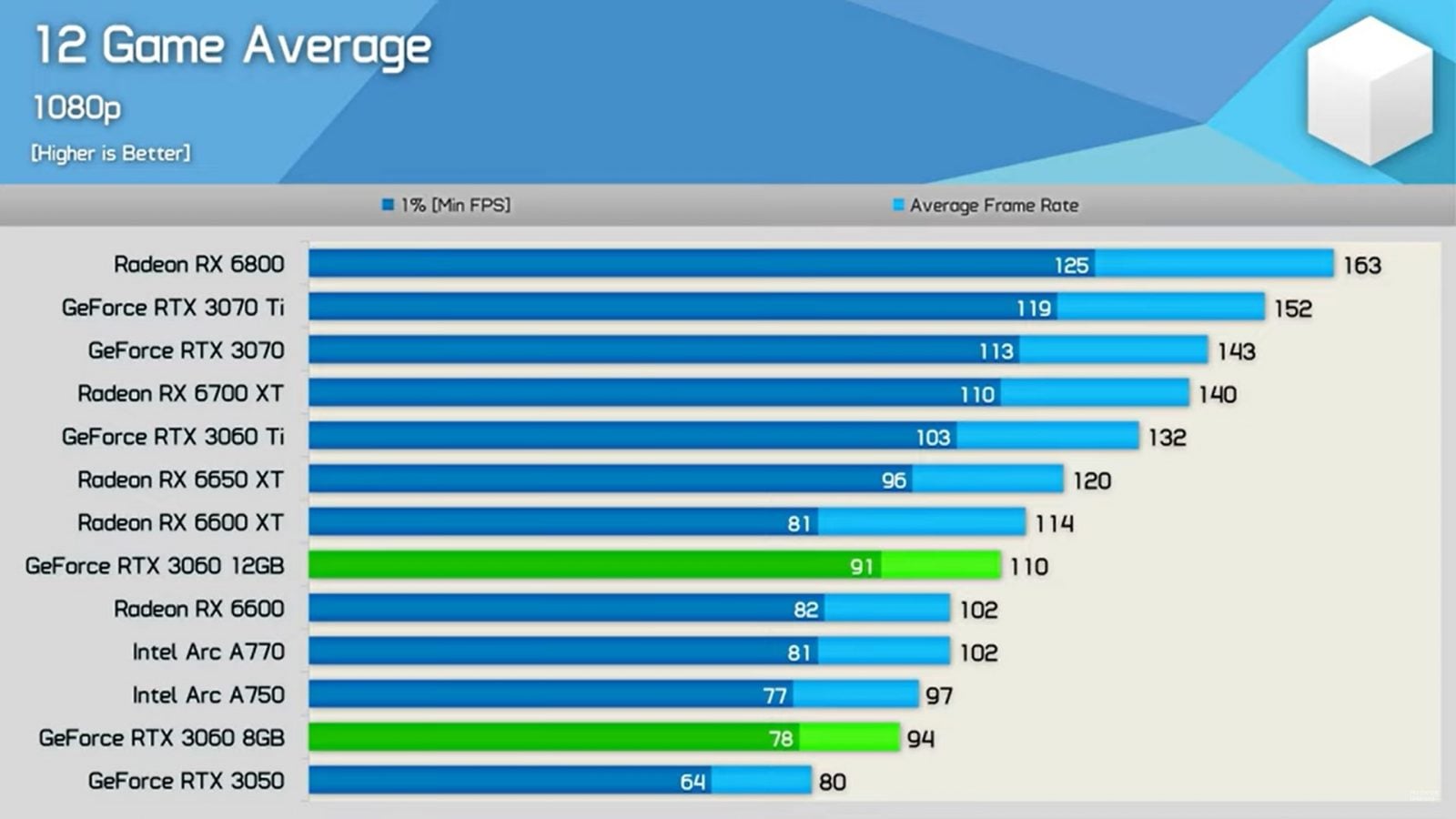 Jak możecie obejrzeć powyżej lub po prostu przyjrzeć się średniej wydajności RTX 3060 8 GB w grach na slajdach zamieszczonych poniżej, ten model karty graficznej nie powinien nigdy powstać, a przynajmniej nie pod tą nazwą. Mimo dzierżenia tej samej nazwy i ceny, oferuje bowiem średnio znacznie mniejszą wydajność zarówno w Full HD (do RTX 3060 12 GB brakuje jej ~15%), jak i 1440p (~30%).