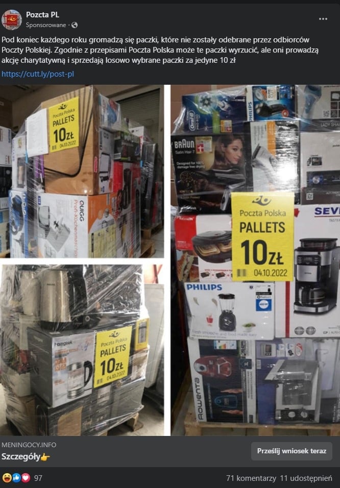 Tymczasem takie kwiatki jak opisywany tutaj przypadek latają po feedzie jako posty sponsorowane. Mamy przekręconą nazwę profilu (jeśli uważnie ją przeczytacie), link ukryty pod skracaczem (standardowa metoda kamuflażu), a do tego ociekającej miodem komentarze rzekomych szczęśliwców, którym za 10 zł trafiła się okazja.
