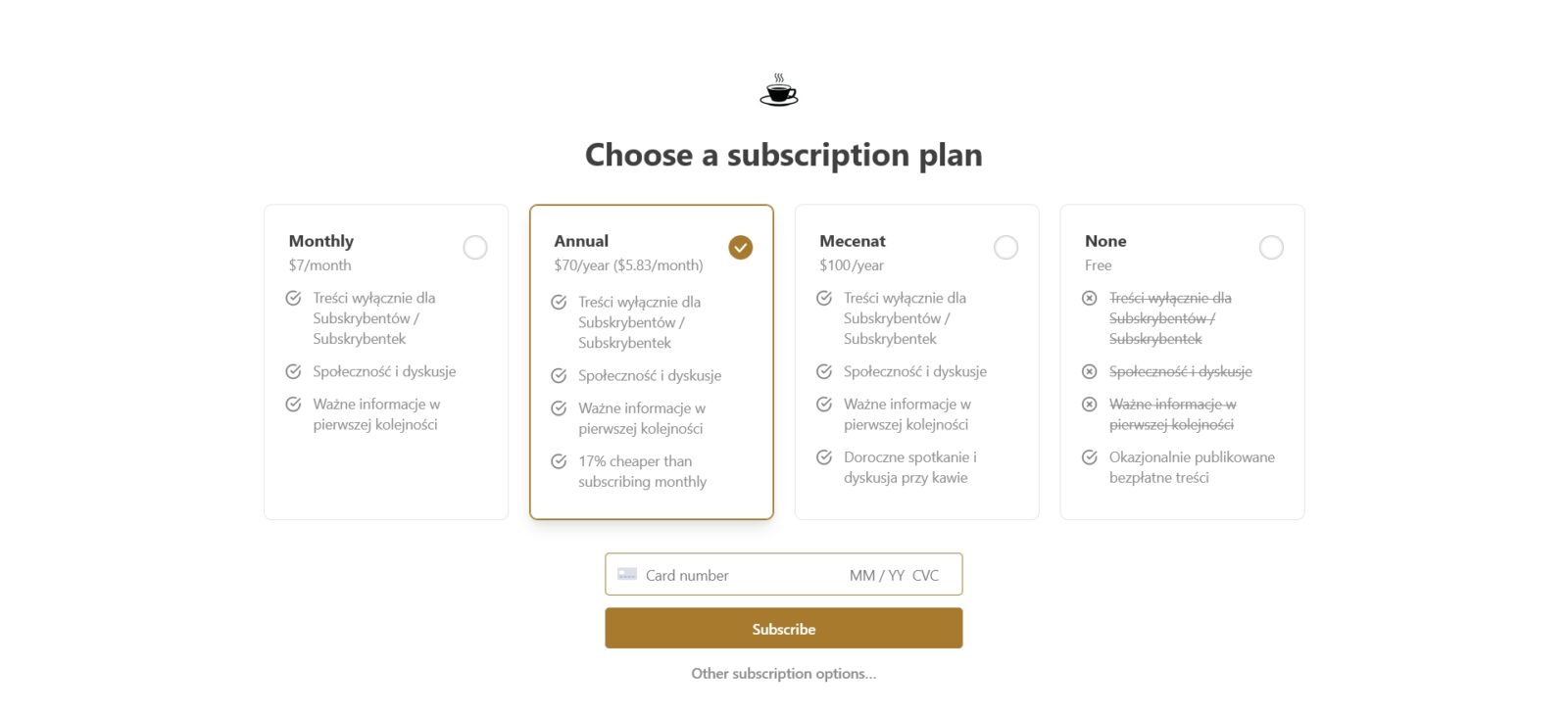 Substack najbliżej da się skojarzyć z platformami Medium oraz Revue (drugi z serwisów obecnie należy już do Twittera). Jednak różnią się one od siebie modelem zarabiania – Substack stawia na kwoty wpłacane przez czytelników w ramach subskrypcji miesięcznej lub rocznej, a także wariant Founding Member (czyli tzw. mecenat dla wpłat wyższych niż roczne). To nie wszystko, bo platforma dopuszcza również subskrypcje grupowe (dla 2 lub więcej osób), darmowy dostęp do treści przez określony czas (żeby zorientować się czy warto).