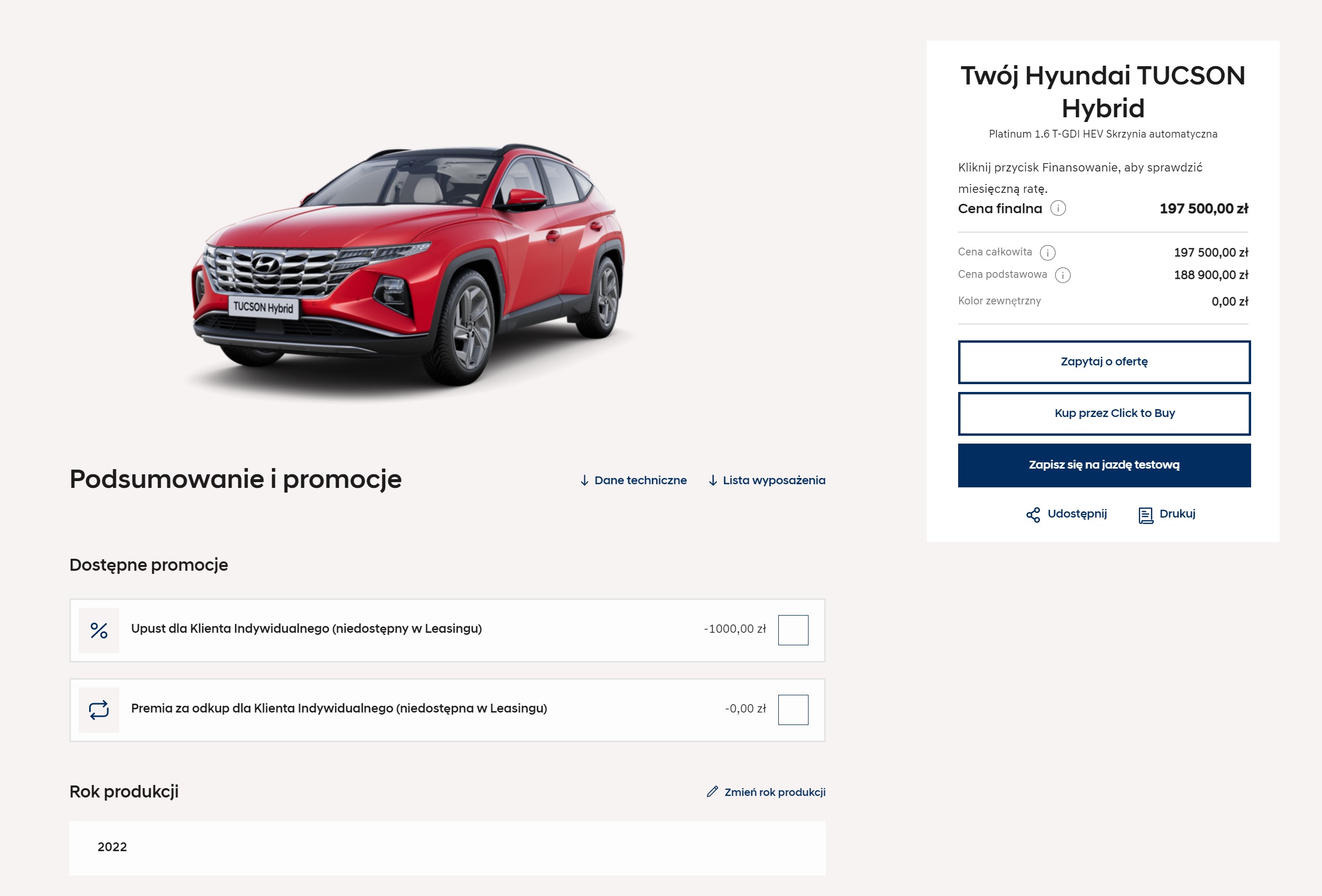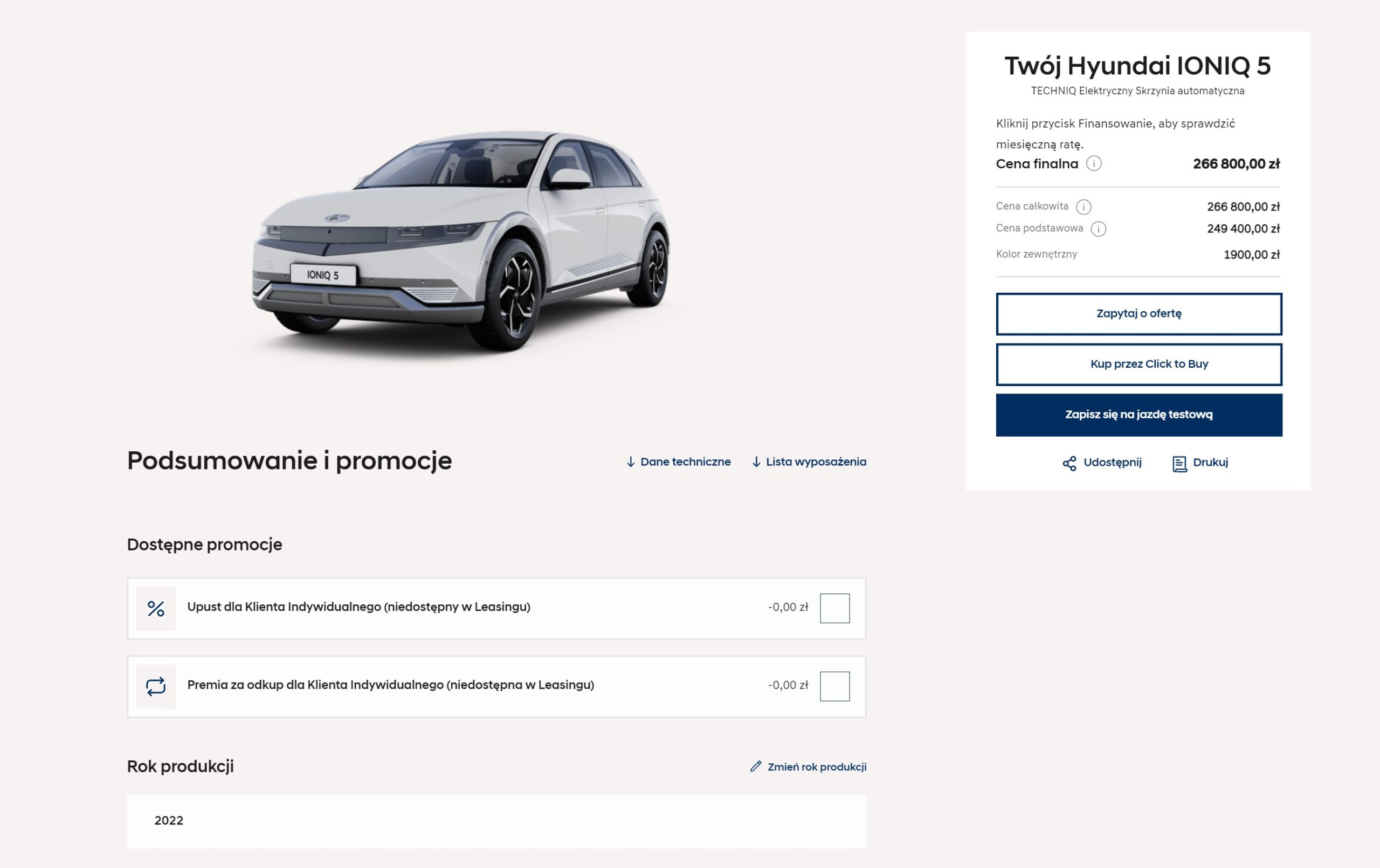 To może Hyundai Ioniq 5? Przyznam, że to auto podoba mi się chyba najbardziej spośród oglądanych aut elektrycznych i w bazowej wersji Dynamiq jest całkiem przyzwoicie wyposażone, ale… zasięg wersji podstawowej jest dość niski, a do tego z jakiegoś przedziwnego powodu podstawowego wariantu nie sposób wyposażyć w podgrzewanie foteli przednich, które jest dostępne dopiero w wersji Techniq. To zaś sprawia, że – po dodaniu obowiązkowego pakietu comfort – nawet wersja z podstawowym silnikiem o zasięgu WLTP 384 km przekracza próg dotacji Mój Elektryk, zaś wersja, która mogłaby mnie interesować, to już koszt 267 tys. zł.