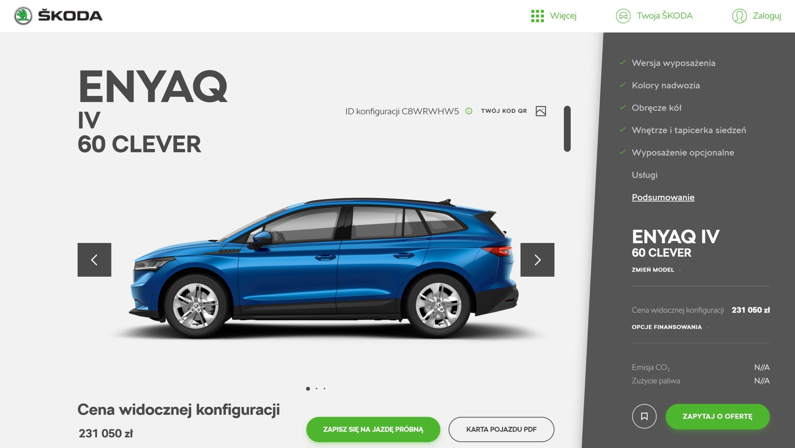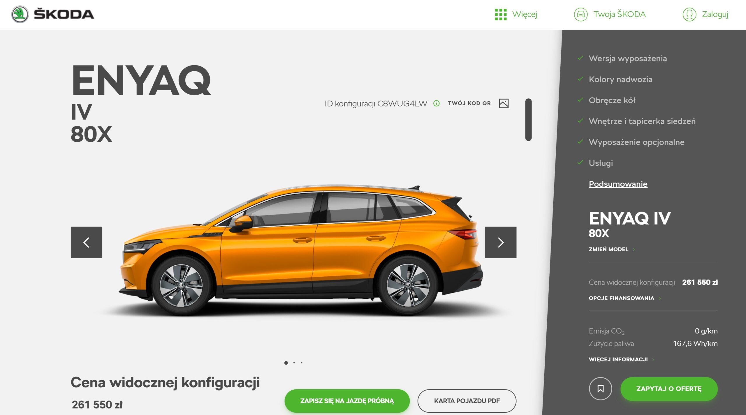 Skoda Enyaq w dość ubogiej wersji 60 Clever, bez praktycznie żadnych dodatków kosztuje już 231 tys. zł. Tymczasem niemal kompletnie wyposażona Skoda Kodiaq Style to koszt niespełna 200 tys. zł. Co więcej, Kodiaq jest tu skonfigurowany w wersji z napędem 4×4 i silnikiem 2.0 TSI 190 KM, rozpędzającym się od 0-100 km/h o sekundę szybciej niż najszybszy Enyaq. Gdybym chciał dołożyć napęd na cztery koła do elektrycznej Skody, skończyłbym z ceną co najmniej 250 tys. zł, a nadal byłoby to auto gorzej wyposażone od spalinowego Kodiaka. Zakładając wspomniane wyżej oszczędności na benzynie na poziomie 10 tys. zł rocznie, różnica w cenie wyrównałaby się po pięciu latach. Ba, o ile pokazany wyżej Kodiaq ma wszystko, czego oczekuje od samochodu, tak pokazany wyżej Enyaq jest znacznie uboższy. Gdybym chciał naprawdę wyrównać wyposażenie i cieszyć się napędem na cztery koła, sytuacja prezentowałaby się tak: