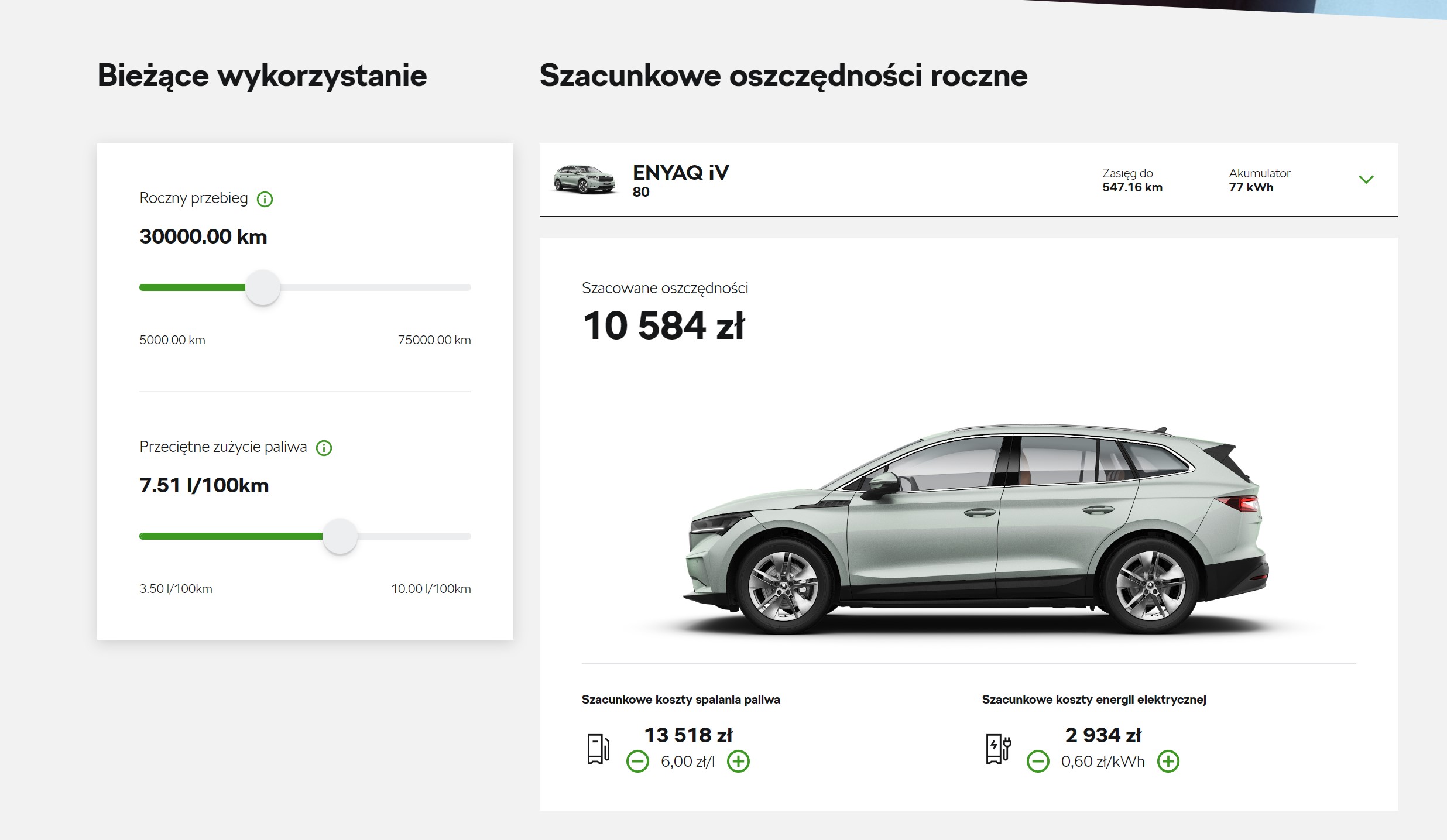 Potwierdza to również m.in. kalkulator Skody – przy jeszcze mniej korzystnych parametrach według tych wyliczeń nadal zapłacę czterokrotnie mniej za ładowanie auta elektrycznego, niż zapłaciłbym za tankowanie porównywalnego auta spalinowego.