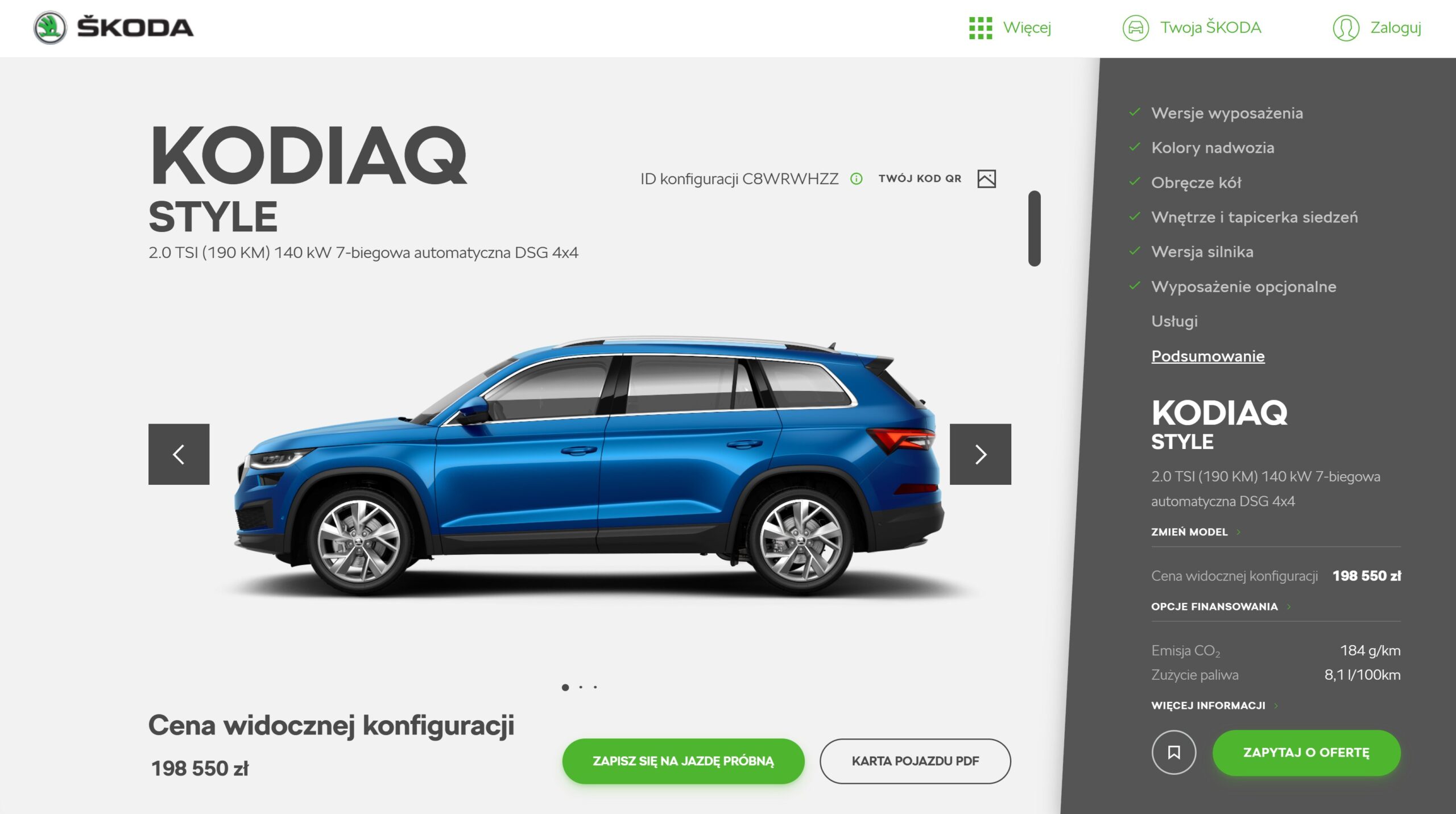 Na początek Skoda, bo jest to opcja, ku której przez długi czas skłaniałem się najbardziej. Modele Kodiaq i Enyaq są do siebie bardzo zbliżone gabarytowo, toteż skonfigurowałem dwa modele i… przewaga na korzyść spalinowego modelu jest po prostu miażdżąca.