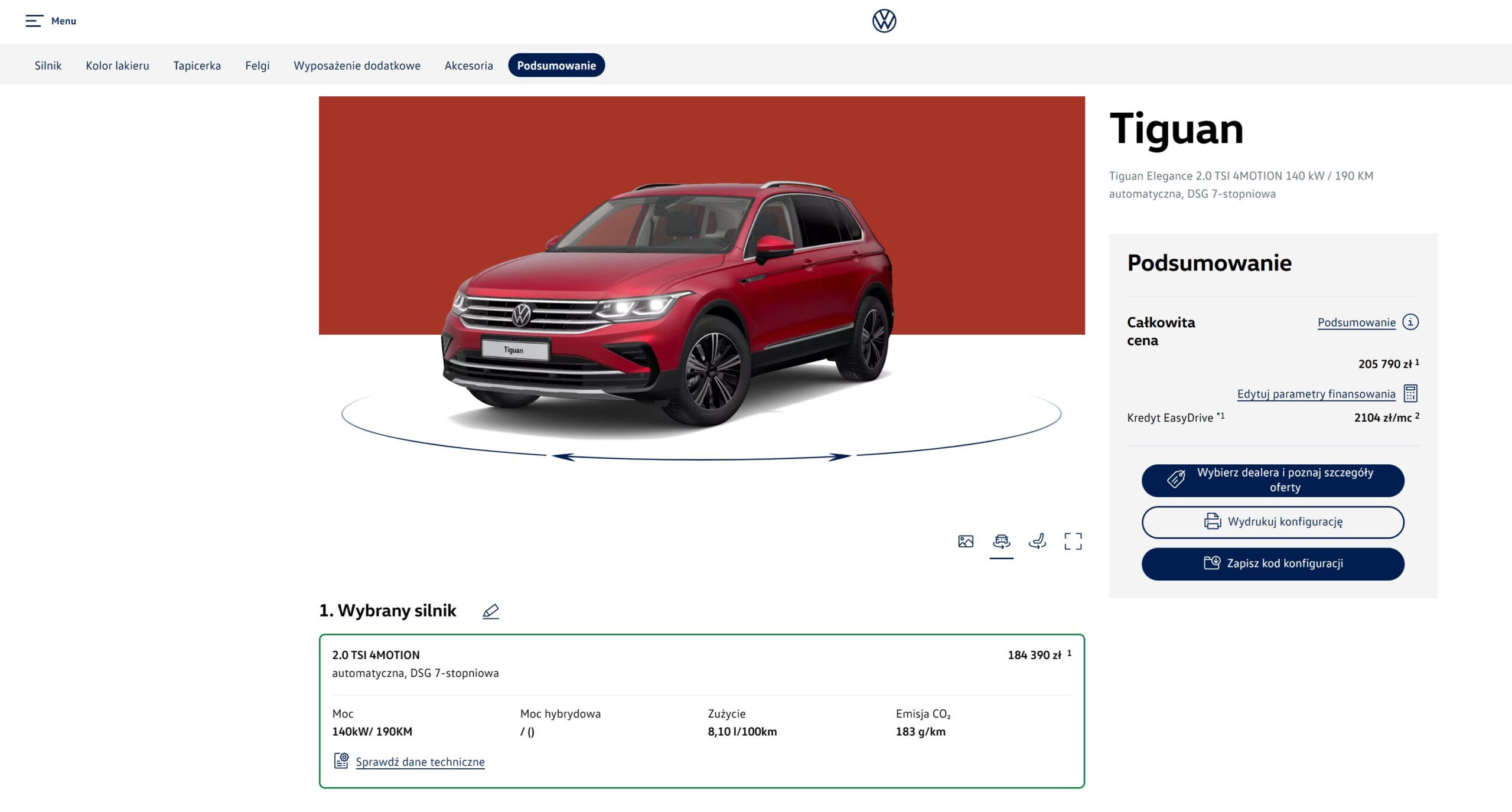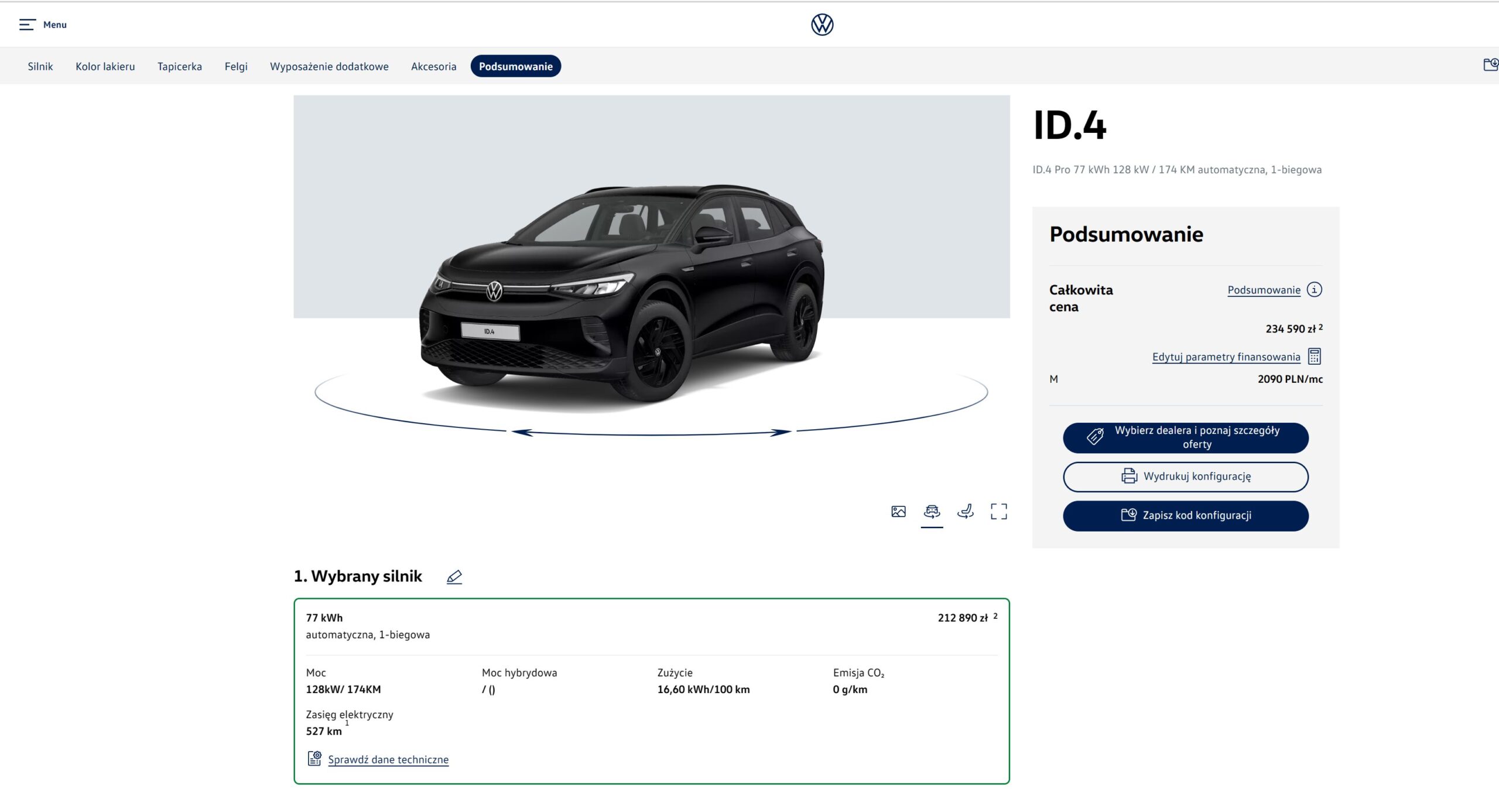 To może Volkswagen? ID.4 w gamie Niemców plasuje się bardzo blisko Tiguana, którego mocno rozważam, więc przyjrzyjmy się różnicom, które… niestety tu również są miażdżące. ID.4 w bazowej wersji jest niesamowicie ubogo wyposażony, jak na auto kosztujące ponad 200 tys. zł. Nie jest to może poziom Audi bez radia w standardzie, ale i tak jest biednie. Najtańsza wersja, którą mógłbym zaakceptować jako własne auto, kosztuje 234590 zł według konfiguratora, zaś wariant, który najbardziej by odpowiadał moim potrzebom to już koszt ponad 260 tys. zł. Tymczasem porównywalny Tiguan, ze znacznie mocniejszym silnikiem i w nieporównywalnie lepszej wersji wyposażenia kosztuje 205 tys. zł. A gdybym chciał wyrównać wersje wyposażenia i moc silnika, okazałoby się, że porównywalny Tiguan kosztuje niespełna 180 tys. Ponownie – ponad 50 tys. zł taniej niż zbliżone auto elektryczne.