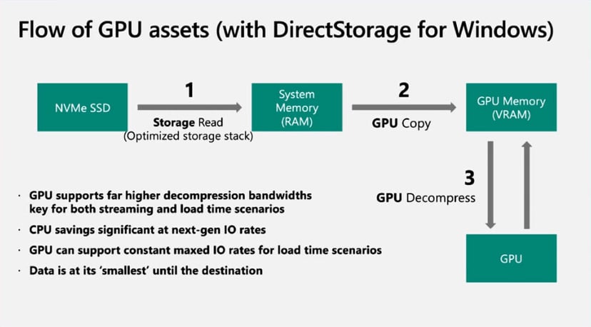Jak już wspominaliśmy dawniej, DirectStorage ma na celu przyspieszenie ładowania i dekompresji zasobów gier, korzystając jeszcze bardziej z karty graficznej oraz jej pamięci VRAM i odciążając tym samym odpowiadający za to zwykle duet (pamięć operacyjną oraz procesor centralny). W praktyce ta technologia przyspiesza przesyłanie skompresowanych danych gry poprzez umożliwienie ich transferu bezpośrednio do VRAM, pomijając w tym całkowicie udział CPU. Dodatkowo DirectStorage umożliwia dekompresowanie przesłanych danych przy użyciu jednostek obliczeniowych GPU, a to bezpośrednio wpływa na zmniejszenie opóźnień podsystemu pamięci masowej i wykorzystania procesora.