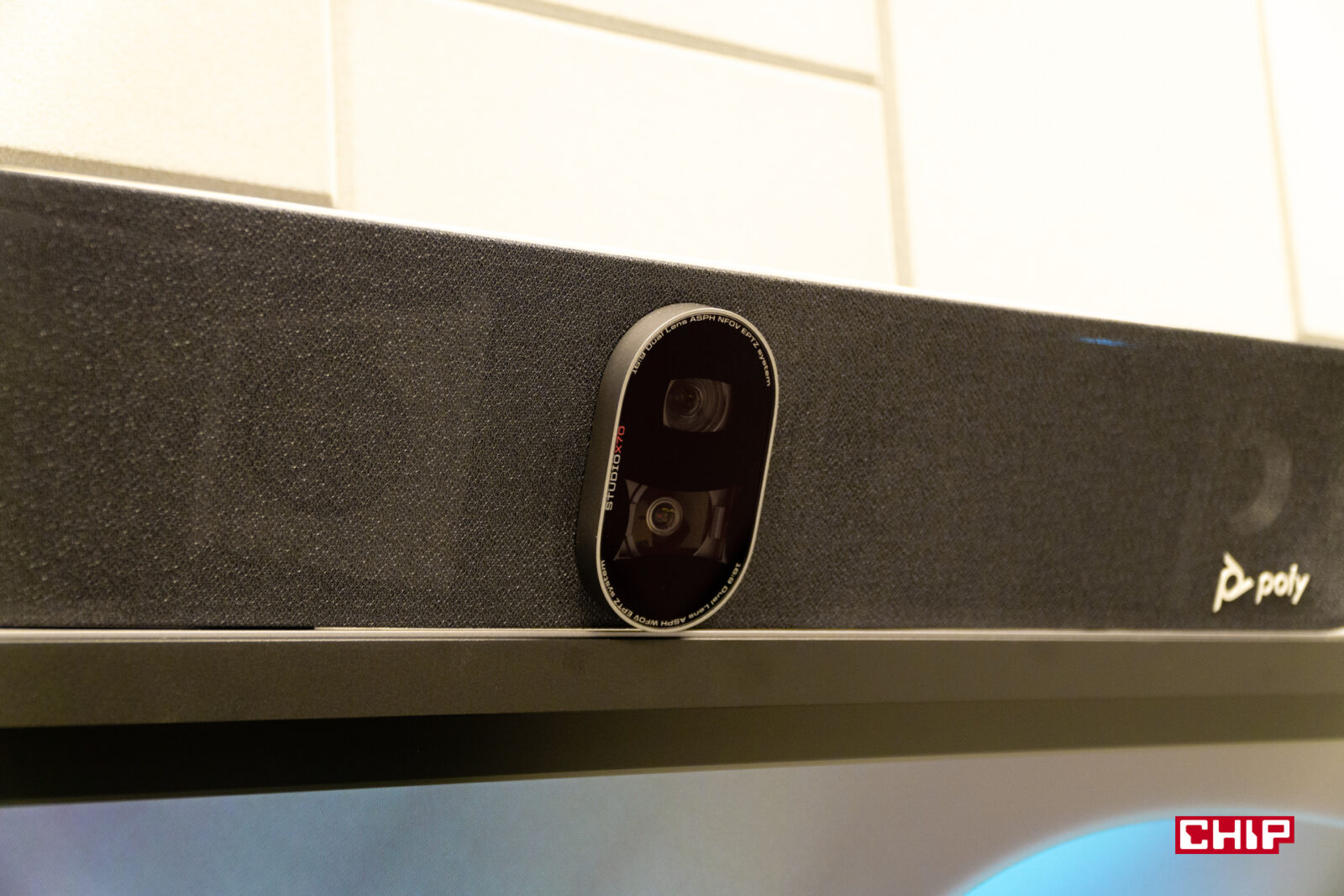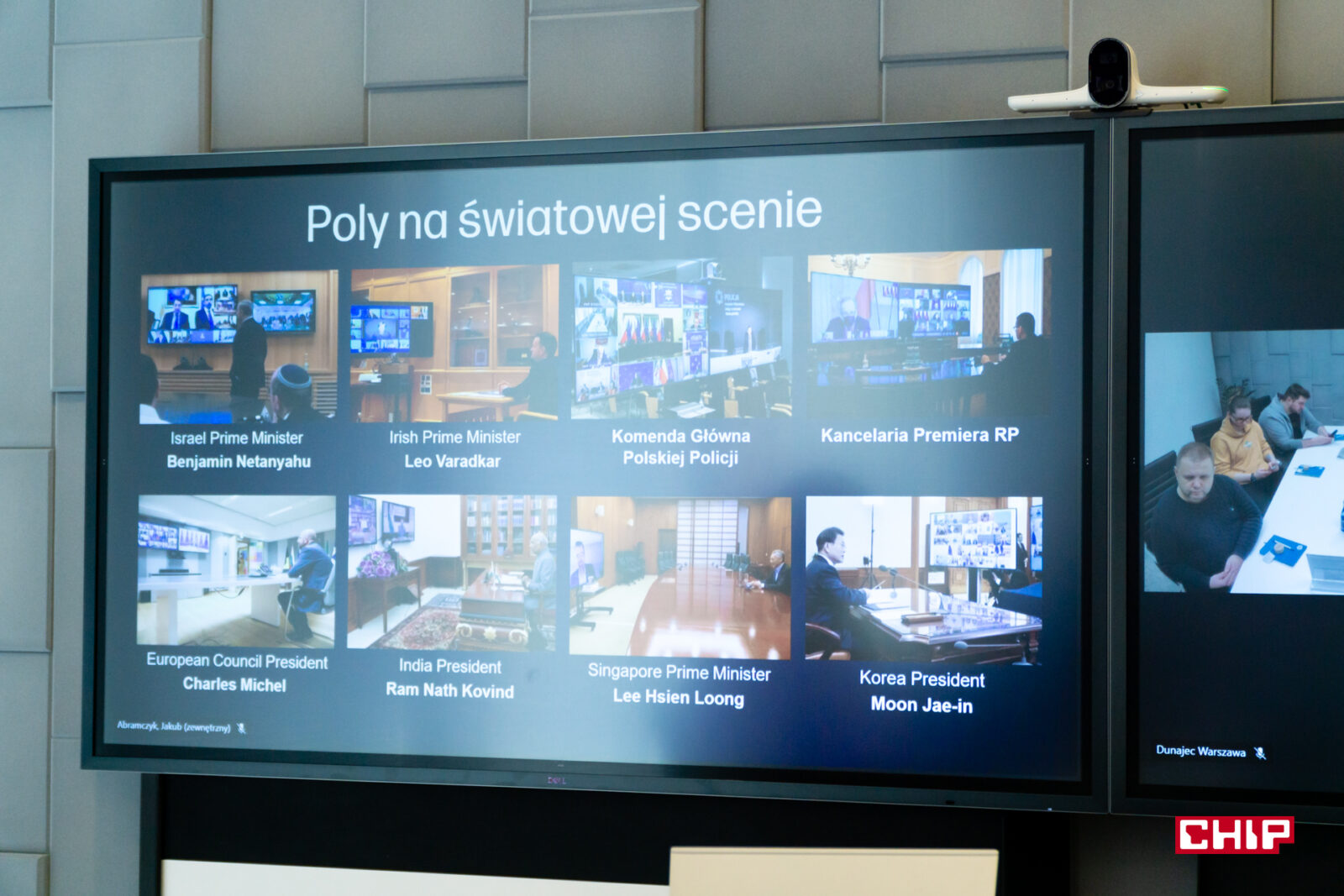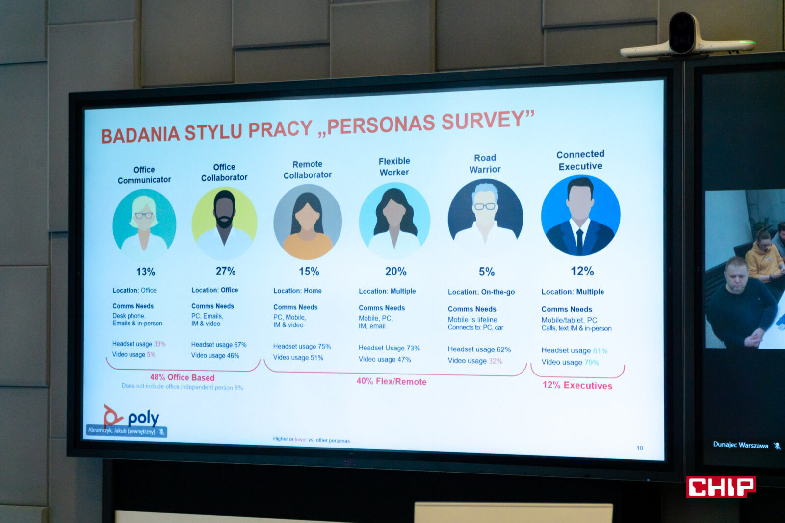 Dla każdej z powyższych grup w warszawskim biurze HP i Poly udało się zgromadzić ciekawe rozwiązania do pracy hybrydowej, dzięki którym być może uda się wyeliminować szereg problemów pojawiających się przy takich spotkaniach. Wśród nich znajdowały się m.in. kamery wyposażone w podwójne obiektywy: jeden prezentował ogólny widok sali zaś drugi był w stanie skierować się na osobę, która właśnie zabrała głos.