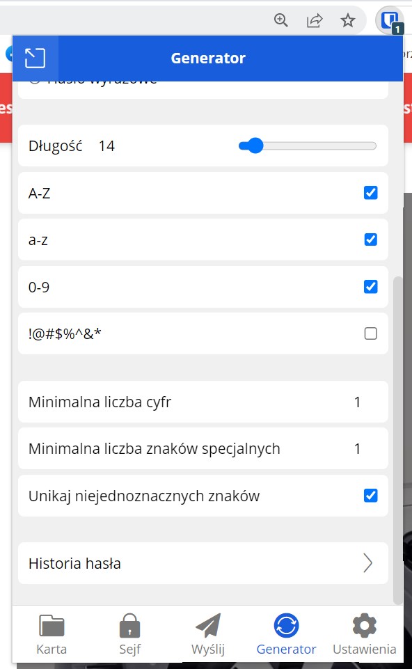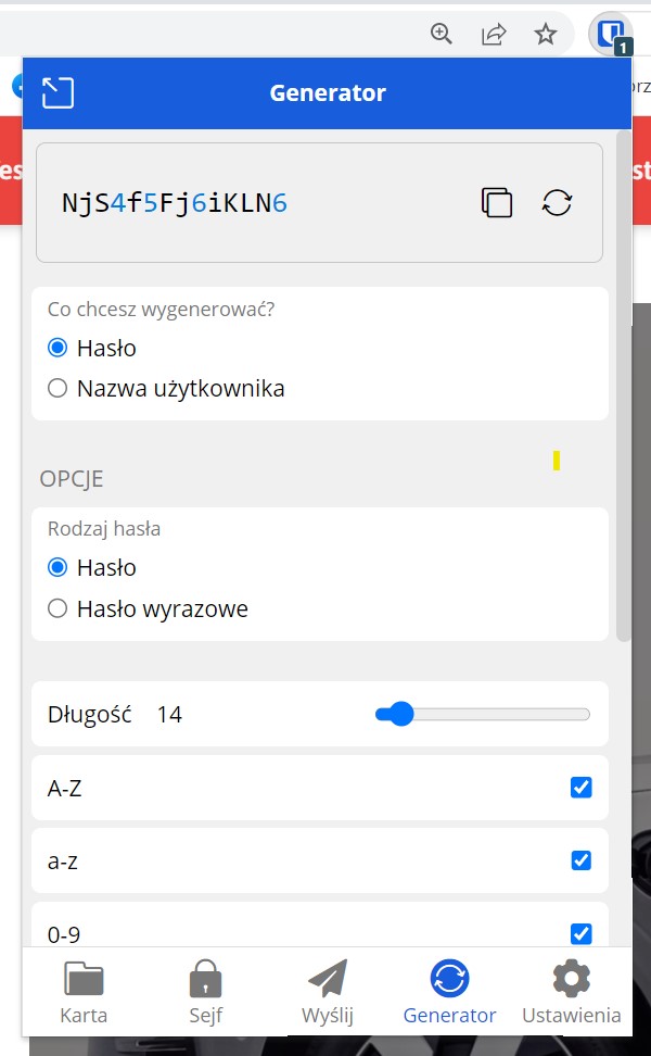 Jak wymyślić hasło w Bitwarden? To banalnie proste – można to zrobić albo z poziomu aplikacji, albo z poziomu rozszerzenia w przeglądarce. W każdym przypadku możemy wybrać długość hasła, zastosowane znaki, a nawet minimalną liczbę cyfr i znaków specjalnych. Wystarczy przejść do sekcji “generator” i tam dobrać odpowiednie parametry.