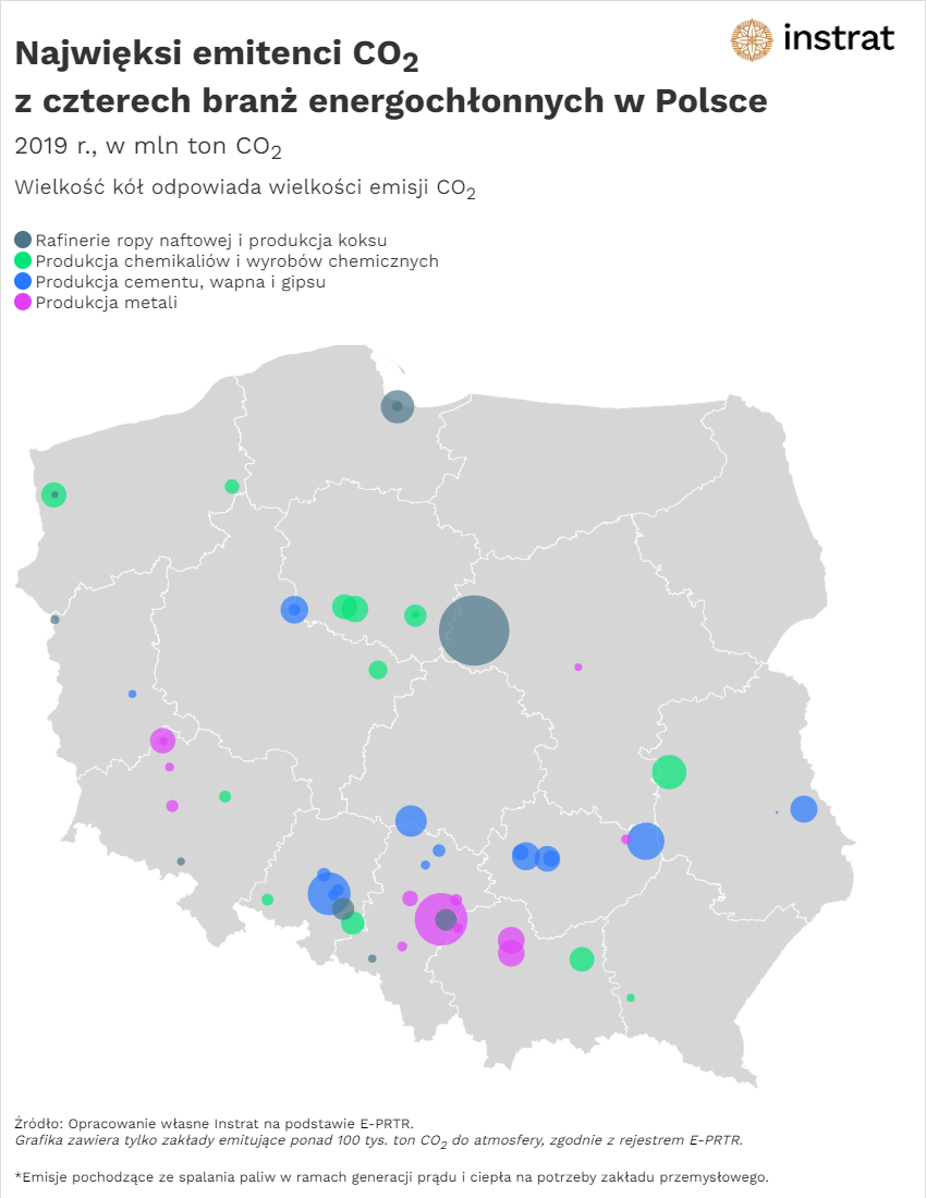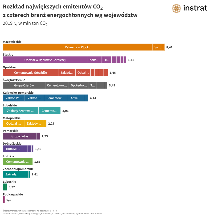 Polski think-tank Instrat opublikował raport prezentujący listę 55 zakładów przemysłowych w naszym kraju, które emitują najwięcej dwutlenku węgla. Raport pokazuje dane z podziałem na cztery branże energochłonne, województwa i ujawnia także nazwy konkretnych zakładów. Nie zostały w nim przedstawione wyniki dotyczące elektrowni węglowych.
