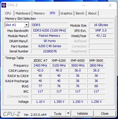 Patriot Viper Venom 2×16 GB 6200 MHz CL40 pracują z napięciem 1,35 V. Warto tutaj zwrócić jednak uwagę, że zapisane mamy łącznie trzy profile XMP. Oprócz domyślnych parametrów mamy też 6000 MHz CL 36-36-36-76 oraz 5600 MHz CL 36-36-36-68. Obra pracują przy napięciu 1,25 V. Pamiętajcie tylko, że na platformie Intela będą one działały przy Gear 2. Wysokość pamięci to ok. 43 mm, czyli podobnie do kości G. Skill Z5 RGB. Nie są to więc jakoś wybitnie wysokie konstrukcje, ale też nie są najniższe jak na brak podświetlenia. Za same kości odpowiada SK Hynix.