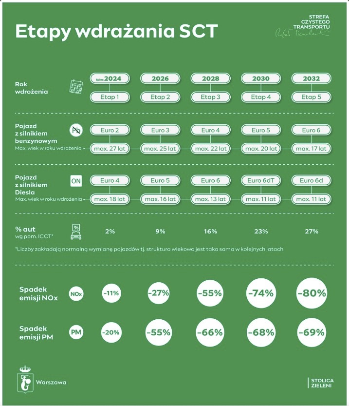 Warszawska Strefa Czystego Transportu będzie wprowadzana stopniowo, w pięciu etapach, aż do 2032 roku. Zgodnie z poniższym schematem: