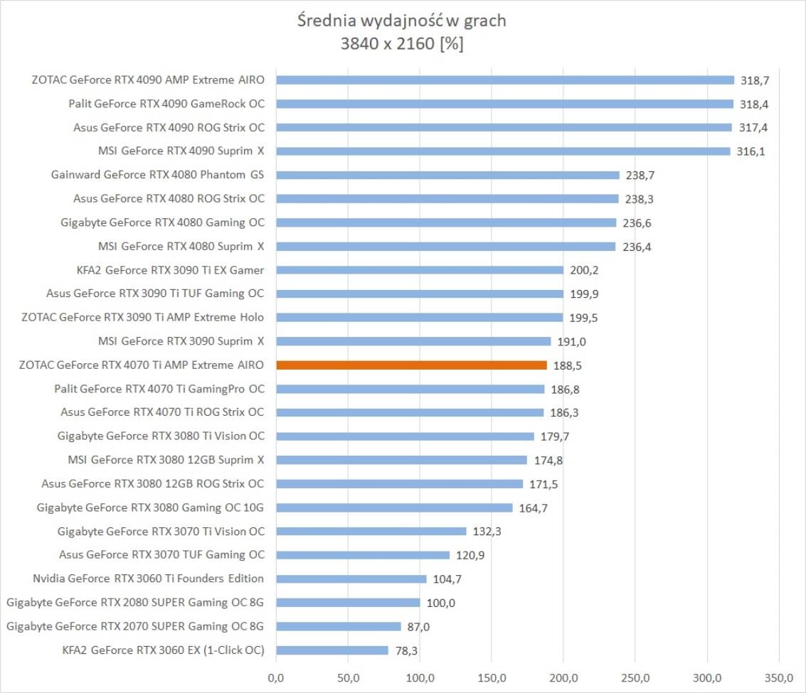 Model ZOTACa wypada najlepiej spośród testowanych RTX 4070 Ti. W pierwszej z rozdzielczości bez problemów też pokonuje RTX 3090 Ti i jest wydajniejszy od tej karty.