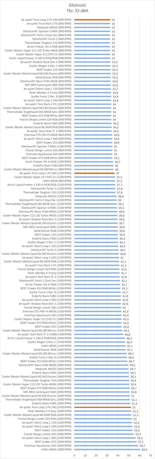 Na maksymalnych obrotach AiO jest najwydajniejsze spośród wszystkich testowanych chłodzeń. Nie jest też aż tak głośne, jak potrafi być konkurencja, ale też nie jest ciche. Natomiast trzeba tutaj pamiętać o obrotach wynoszących 2500 RPM. Na 1200 RPM jest już znacznie ciszej i tutaj jest bardzo dobrze, ale też wydajność znacznie spada i chłodzenie ląduje po drugiej stronie – jest jednym ze słabszych AiO 240. Na 800 RPM ponownie wyniki są słabsze, ale chłodzenia w ogóle nie usłyszycie. Wszystko więc zależy od obrotów wentylatorów, na jakim chłodzenie będzie działało.