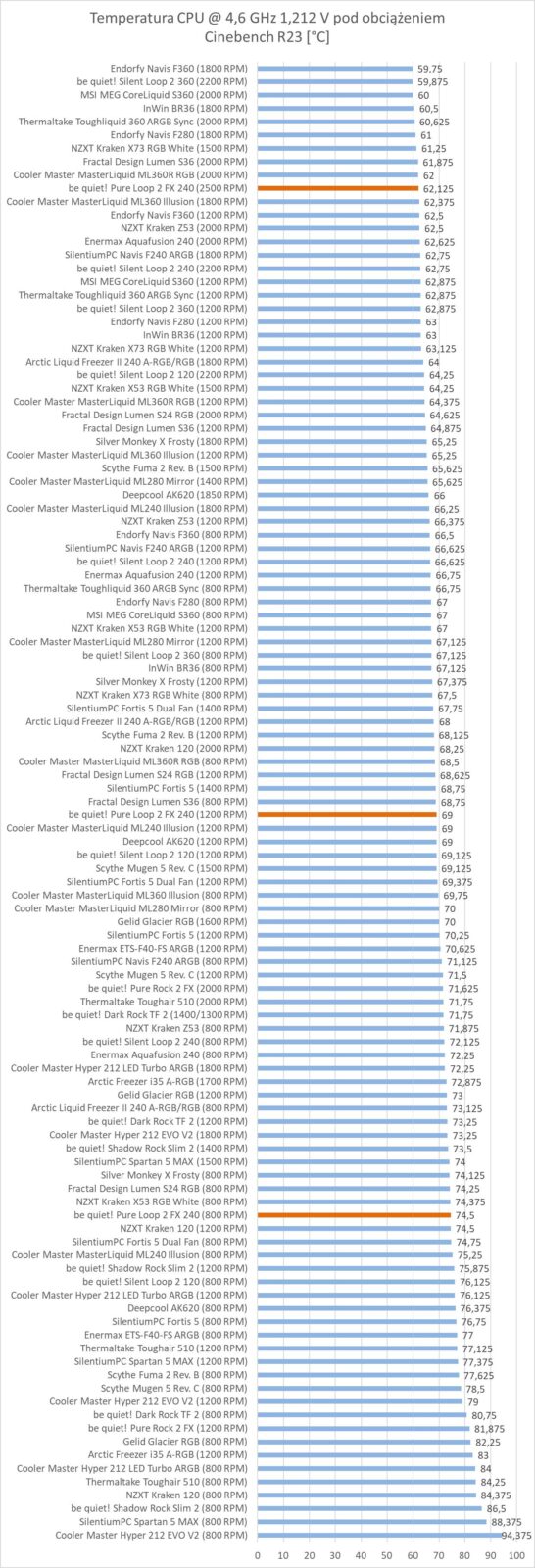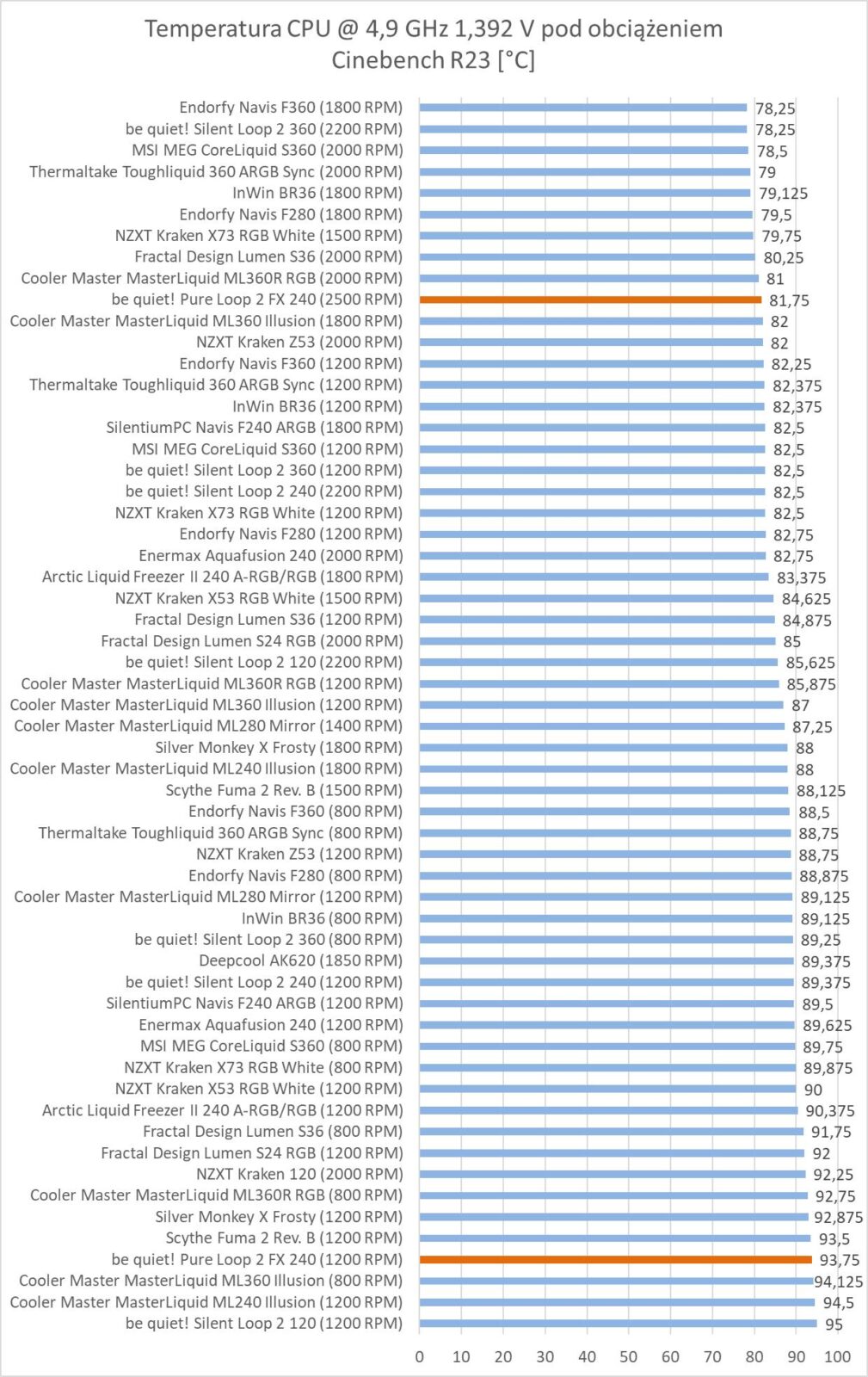 Na maksymalnych obrotach wydajność jest naprawdę dobra. Chłodzenie wypada najlepiej spośród wszystkich AiO 240, co jest warte uwagi, ale należy pamiętać, że maksymalne obroty wentylatorów to aż 2500 RPM. Na 1200 RPM i 800 RPM robi się już słabiej i AiO zaczyna odstawać od najlepszych i zbliżać się do najsłabszego ML240 Illusion od Cooler Mastera. Po OC na 800 RPM rdzenie dobijały do 100°C, co jest standardem przy wszystkich AIO 240.