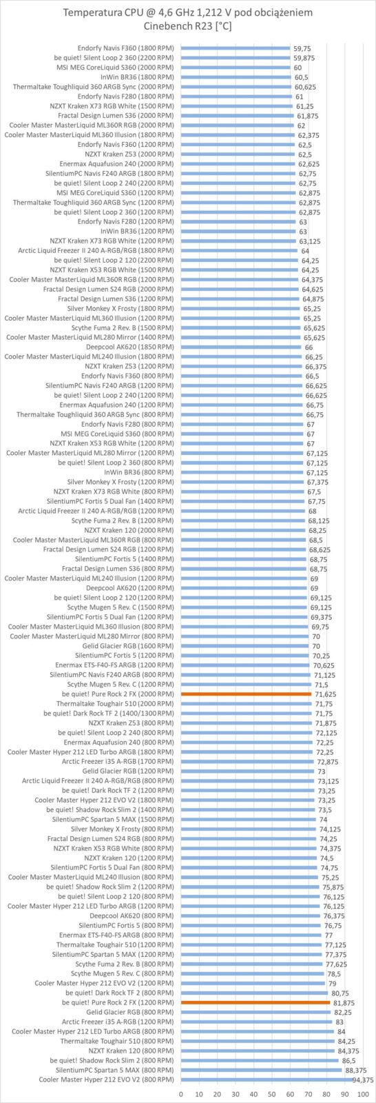 Na maksymalnych obrotach wyniki są naprawdę dobre jak na taką konstrukcję. Tutaj wydajność plasuje chłodzenie na poziomie propozycji od Thermaltake, która ma dwa wentylatory. Gorzej robi się jednak wraz ze spadkiem obrotów. Na 1200 RPM chłodzenie wypada już znacznie słabiej i przegrywa choćby z Hyper 212 EVO V2 od Cooler Master. Choć muszę zauważyć, że jest wyżej niż Freezer i35 od Arctica. Na 800 RPM jeden z rdzeni dobił do 100°C i tutaj test nie został zaliczony.