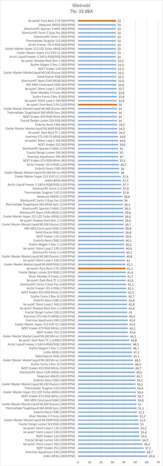 Pod względem głośności jest to hit. Na maksymalnych obrotach jest naprawdę cicho jak na 2000 RPM, na 1200 RPM praktycznie nie usłyszycie wentylatora. Na 800 RPM to już w ogóle nie ma o czym mówić – jest fenomenalnie. Jest to najcichsze chłodzenie na 1200 RPM i 2000 RPM, więc gratulacje dla be quiet!.
