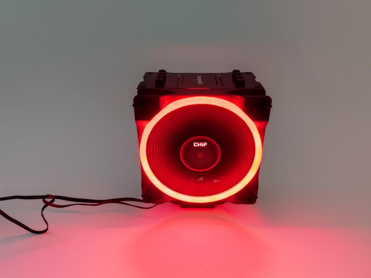 Dołączone śmigło to model Light Wings 120 mm PWM high-speed, którego zwykłą wersję miałem okazję testować. Śmigło pracuje z maksymalną prędkością 2000 RPM, a producent w tym przypadku nie podaje pozostałych parametrów. Wyjątkiem jest głośność, która ma maksymalnie wynosić 24,4 dBA. Wentylatory w zwykłej wersji w testach wypadły naprawdę cicho, ale przeciętnie pod względem wydajności. Pamiętajcie jednak, że wersja high speed ma trochę inną konstrukcję, choćby więcej łopatek. Zobaczymy więc, jak śmigło poradzi sobie podczas pracy na radiatorze. Wentylator ma podświetlenie ARGB i wychodzą z niego dwa kable: 4-pin PWM oraz 3-pin ARGB.