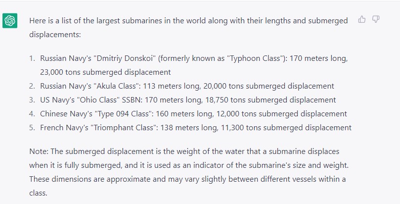 Wystarczyło jednak zapytać bota, czy aby odszukane przeze mnie rozwiązanie również by się nadało i voila, potwierdził moje przemyślenia, a nawet podrzucił wstępny kod do generowania danej struktury i go wyjaśnił. W tego typu scenariuszach sprawdza się więc idealnie…, ale tylko wtedy, jeśli macie proste problemy do rozwiązania. W innym wypadku research jest po prostu koniecznością i to nie w chatbocie, a w starej dobrej przeglądarce. Sprawa ma się bardzo podobnie podczas wyszukiwania ciekawostek i robienia np. zestawień, a świetnym tego przykładem jest moja próba wygenerowania listy pięciu największych okrętów podwodnych na potrzebę artykułu o decyzji rosyjskiej marynarki.