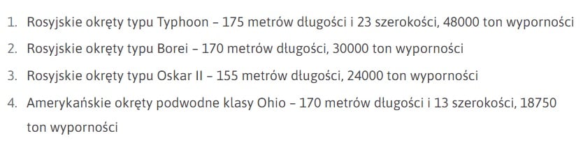Owoc pracy ChatGPT możecie podejrzeć powyżej… tyle tylko, że obeznani w świecie okrętów podwodnych wiedzą, że ten TOP 5 to wierutne bzdury. Sztuczna inteligencja nie tylko nie zadbała o odpowiednią kolejność tego zestawienia, ale też pomyliła kilka wartości i podała nie interesującą mnie wyporność (po zanurzeniu), a tę po wynurzeniu. Innymi słowy, w tej próbie przyspieszenia sobie pracy z ChatGPT finalnie straciłem więcej czasu na weryfikowanie informacji w innych źródłach, bo poprawne zestawienie wygląda o tak: