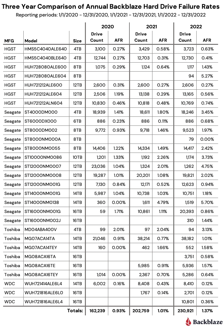 Firma Backblaze od 2013 roku bada trwałość dysków HDD w swoich centrach danych (niektóre z nich na przestrzeni nawet kilkudziesięciu miesięcy). Upływający czas wyraźnie odbija się na awaryjności, co wyraża tzw. AFR (Annualized Failure Rate – roczny wskaźnik awaryjności). Raport z 2022 roku potwierdza, że częstotliwość awarii nośników tego typu zwiększa się wraz z ich wiekiem.