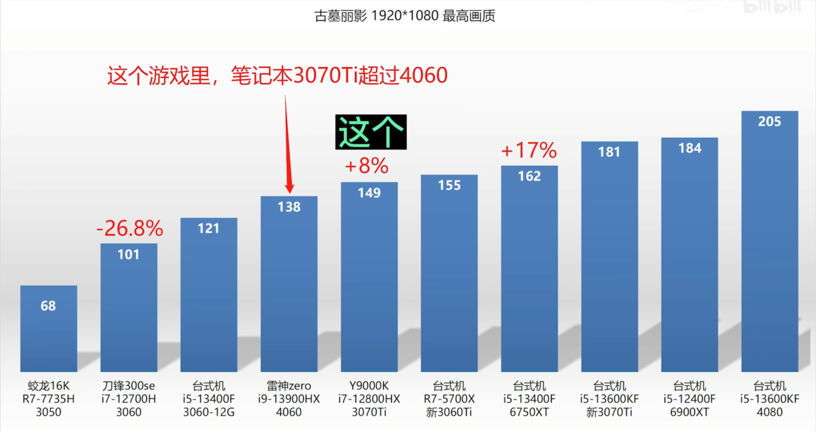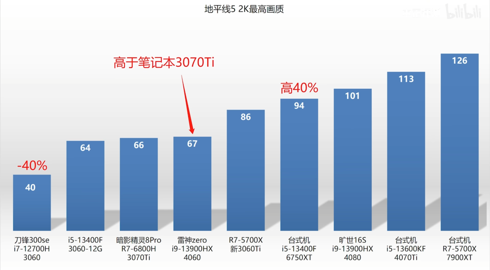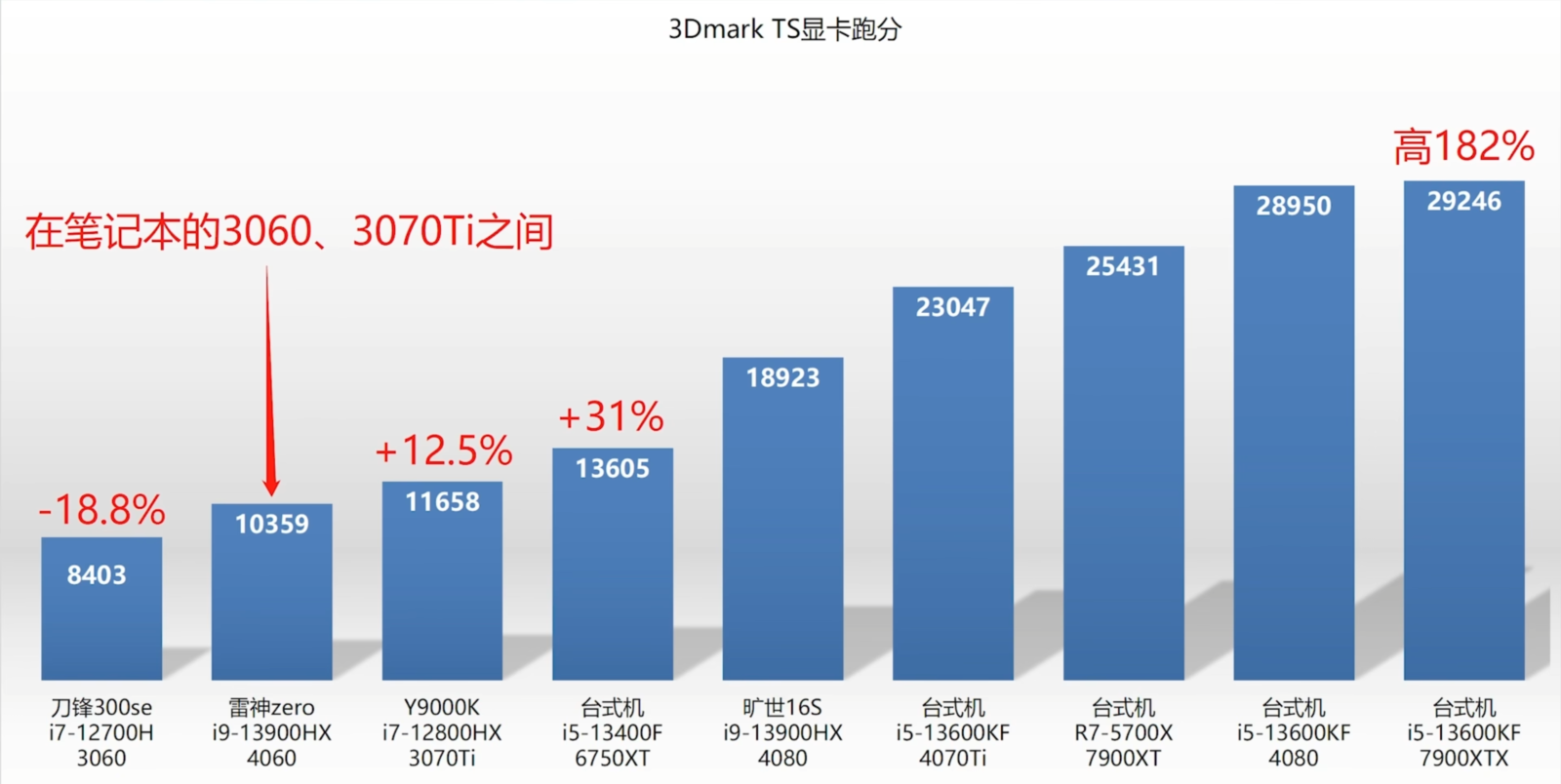 To więc oficjalnie pierwszy raz, kiedy Nvidia zaprojektowała karty graficzne z tej samej serii praktycznie tak samo zarówno dla rynku laptopów, jak i pecetów. Możemy więc teoretycznie wyciągnąć więcej na temat wydajności GeForce RTX 4060 z najnowszego testu jej mobilnej wersji na Bilibili, który objął laptopa Thunderobot Zero z Core i9-13900HX i 16 GB pamięci DDR5-4800 w cenie odpowiadającej poziomowi obecnych laptopów z RTX 3070. Jej TDP zostało jednak podkręcone do 140 watów, czyli spodziewanej maksymalnej wartości poziomu mocy.