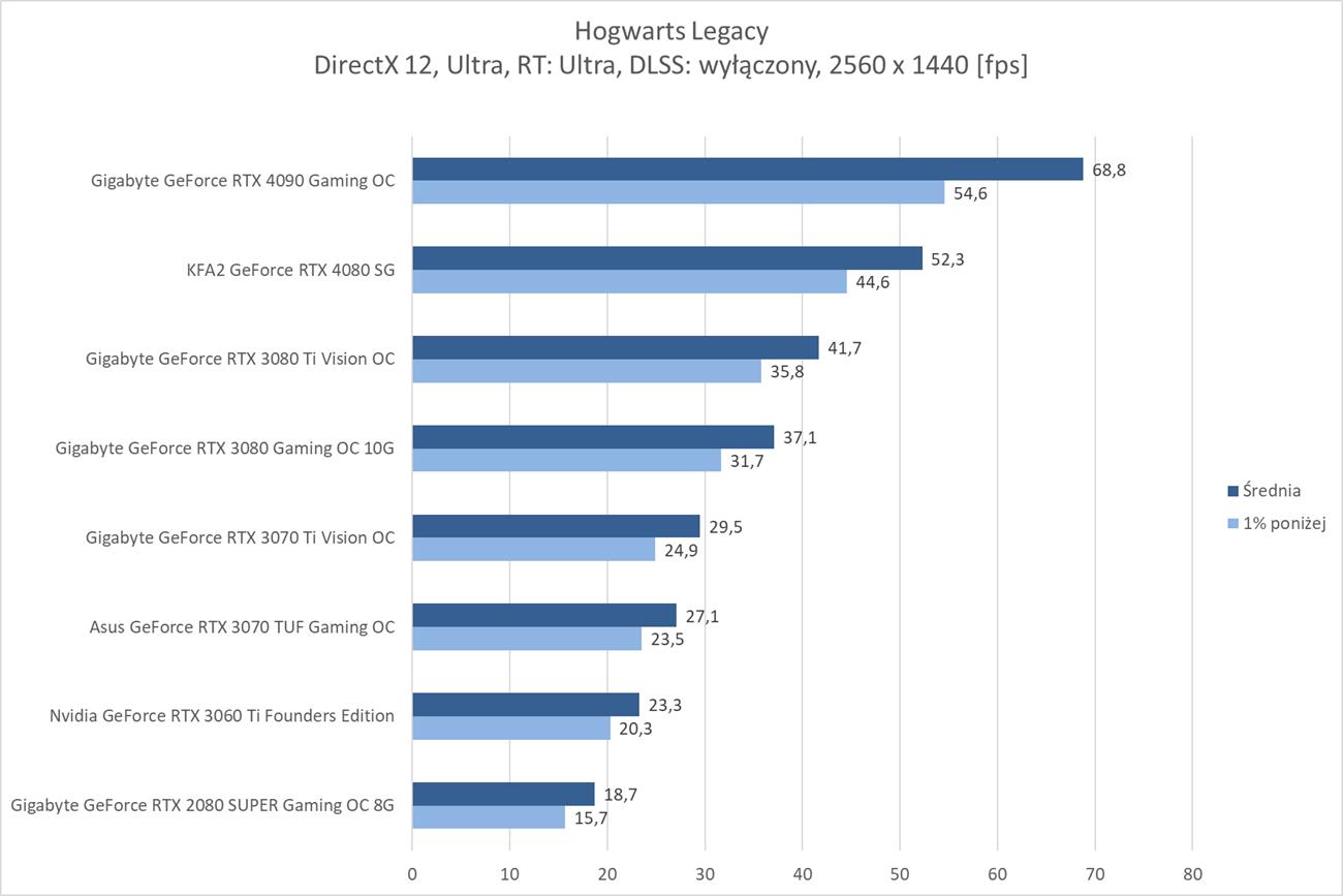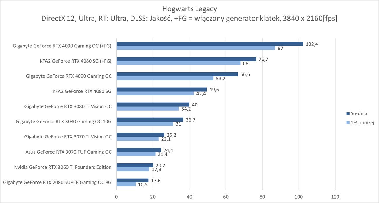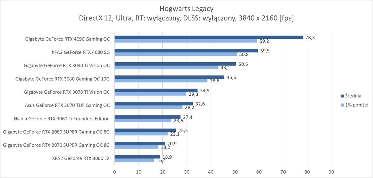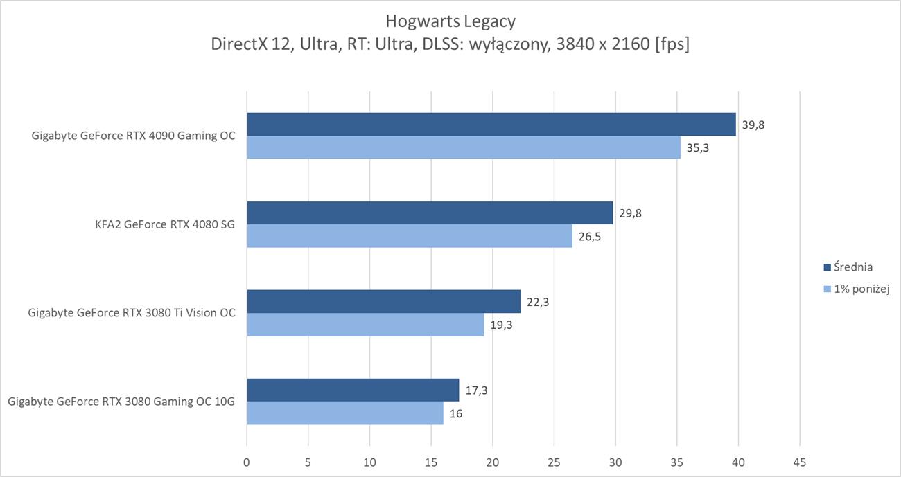 Hogwarts Legacy to zdecydowanie wymagająca dla kart graficznych gra. W samej rasteryzacji w 3840 x 2160 średnio blisko 60 fps zapewnia RTX 4080, więc bez najwydajniejszych kart lub DLSS nie ma co odpalać takich ustawień. Wymagania znacznie się zwiększają jeśli włączycie ray tracingu w trybie Ultra. Tutaj w 3840 x 2160 żadna z kart nie jest w stanie osiągnąć śrendio 60 fps. Na pomoc przychodzi DLSS, który jednak w trybie jakość sprawia, że tylko RTX 4090 przebija średnio 60 fps.