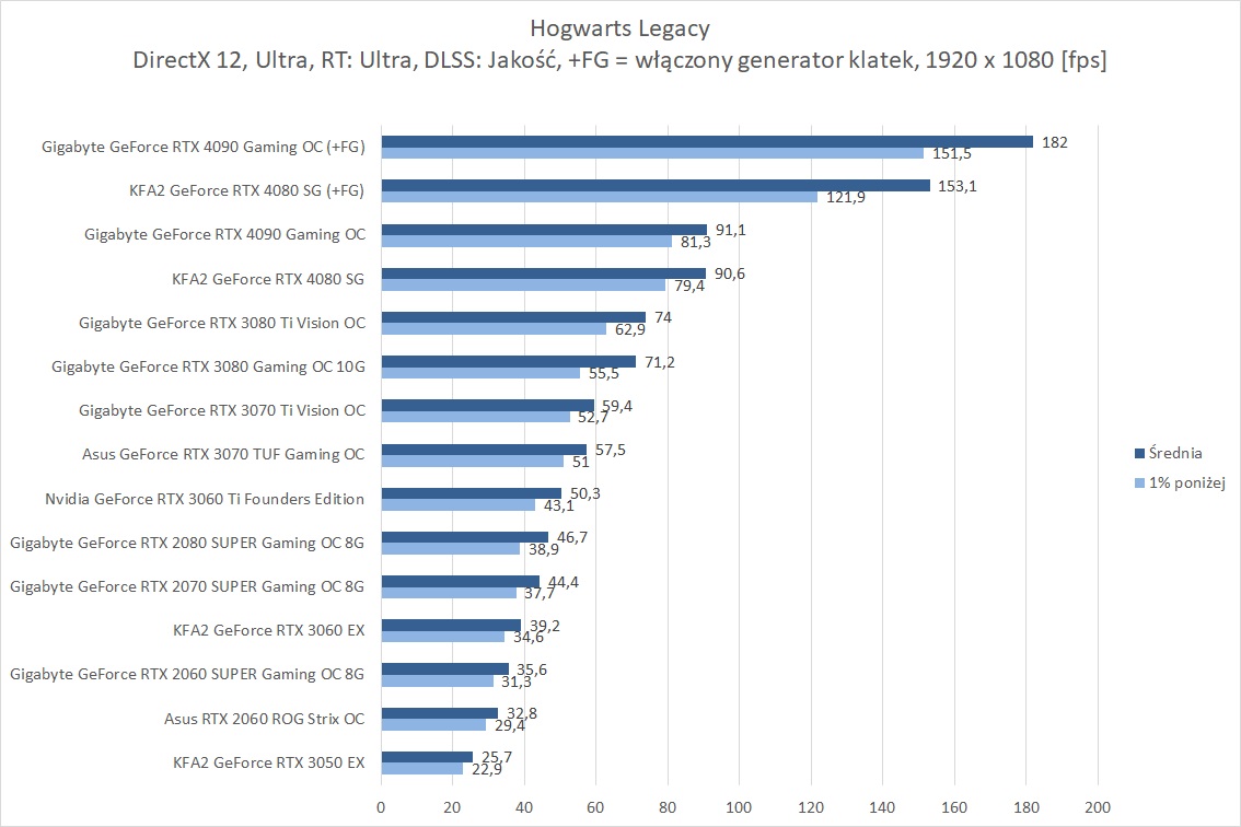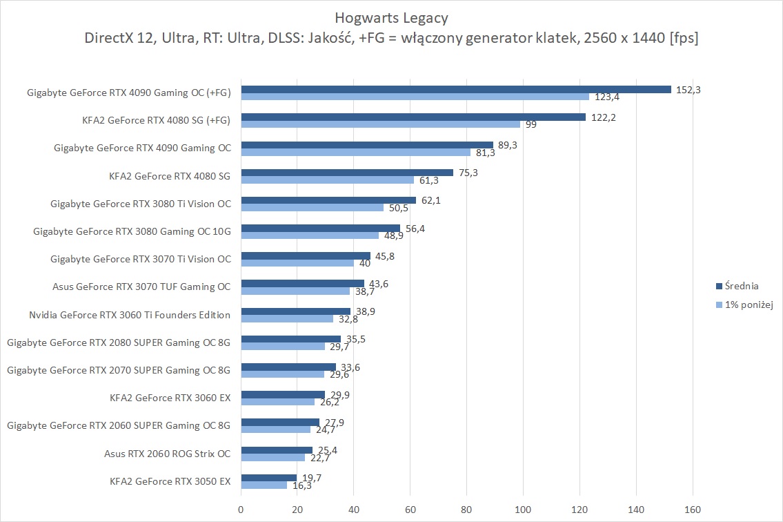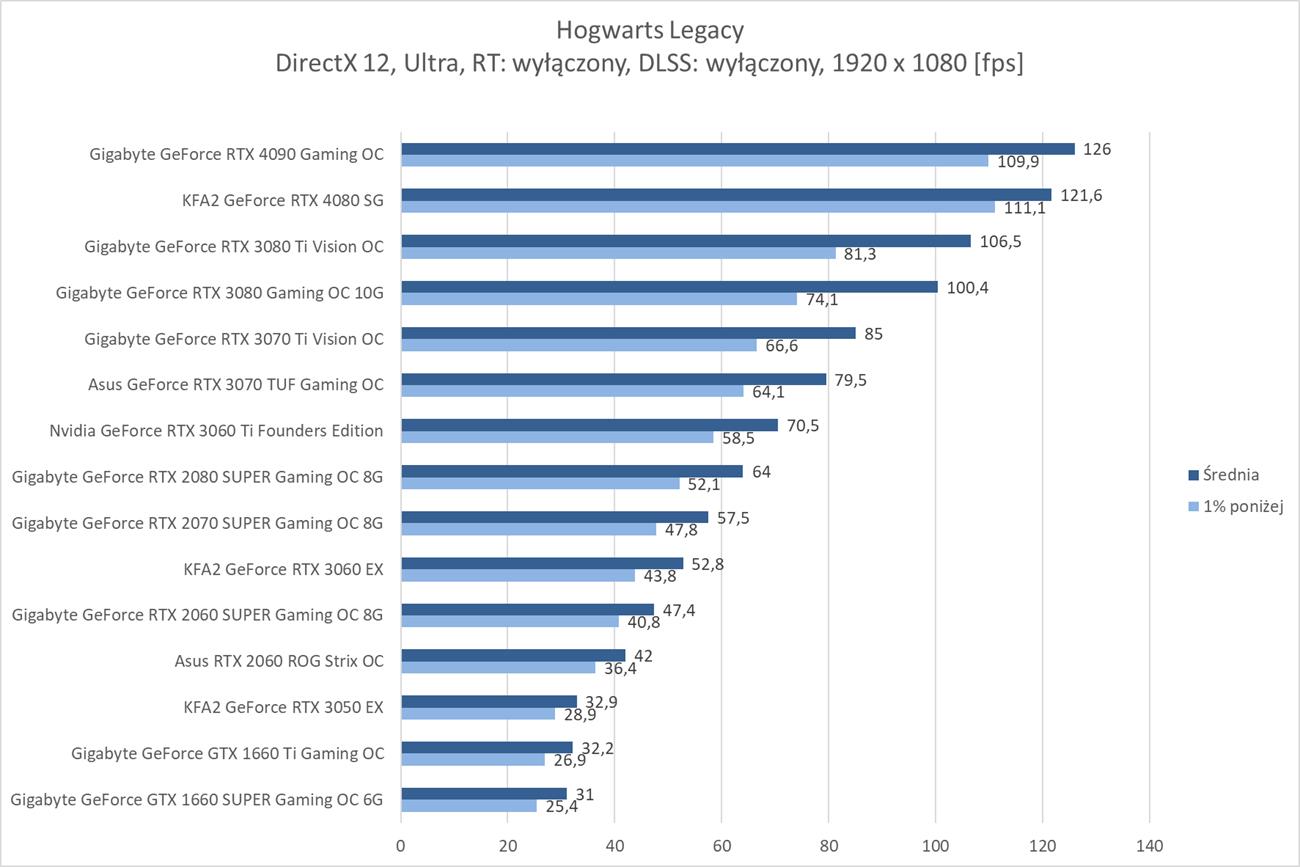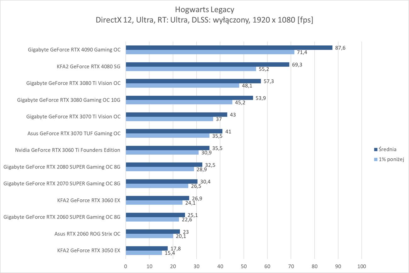 Hogwarts Legacy to zdecydowanie wymagająca dla kart graficznych gra. W samej rasteryzacji w 3840 x 2160 średnio blisko 60 fps zapewnia RTX 4080, więc bez najwydajniejszych kart lub DLSS nie ma co odpalać takich ustawień. Wymagania znacznie się zwiększają jeśli włączycie ray tracingu w trybie Ultra. Tutaj w 3840 x 2160 żadna z kart nie jest w stanie osiągnąć śrendio 60 fps. Na pomoc przychodzi DLSS, który jednak w trybie jakość sprawia, że tylko RTX 4090 przebija średnio 60 fps.