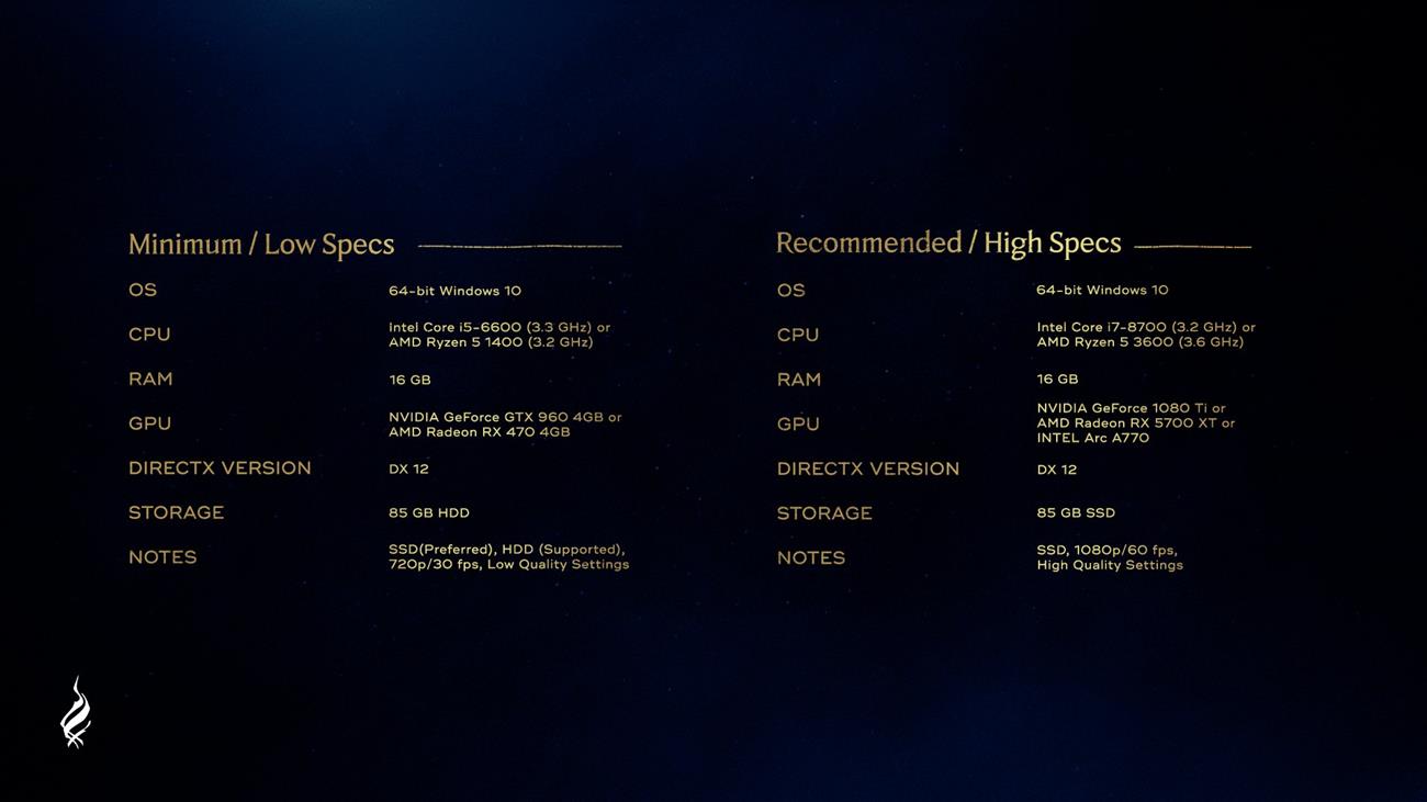 Minimalne wymagania dotyczące rozdzielczości 720p, 30 fps i niskich ustawień nie są wcale wysokie. GTX 960, i5-6600, 16 GB RAM czy 85 GB na dysku nie powinno zaskakiwać ani stwarzać większych problemów. Ciekawiej robi się wraz ze wzrostem ustawień. Przy Ultra (1440p w 60 fps) musicie już mieć 10700K/5800X, 32 GB RAM oraz kartę pokroju RTX 2080 Ti. Przy Ultra 4K potrzeba już nawet RTX 3090 Ti, aby uzyskać 60 fps w 2160p. Gra na maksymalnych ustawieniach powinna być więc bardzo wymagająca dla sprzętu, a w szczególności dla kart graficznych. Widać też już nowy trend, zgodnie z którym twórcy gier zalecają 32 GB pamięci RAM przy maksymalnych ustawieniach. Podobnie było w przypadku Forspoken.
